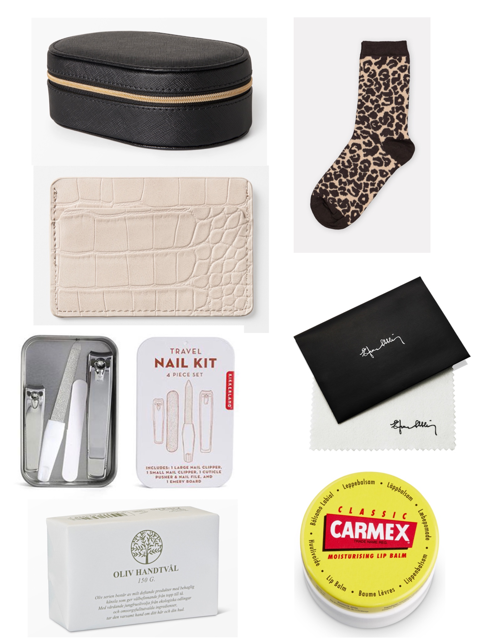 Smyckesskrin HÄR // Strumpor HÄR // Korthållare HÄR // Polerduk HÄR // Nagelkit HÄR // Läppbalsam HÄR // Handtvål HÄR