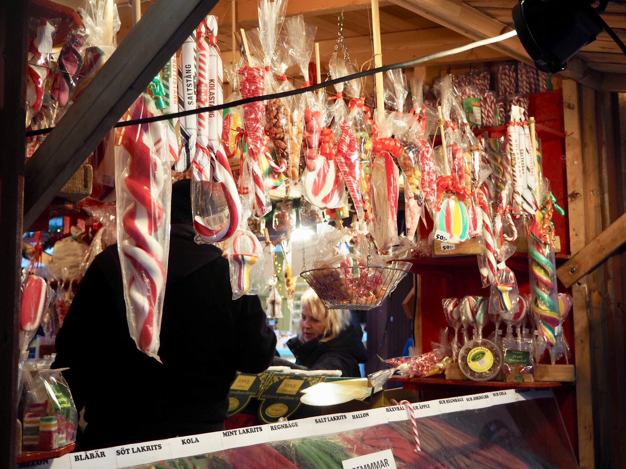 De här röda stugorna är fyllda av en massa härligheter. Allt från godis, smycken, keramik och glögg. Ser ni den söta lilla muggen med tomten på? Hade inte karlarna kvistat vidare så fort så hade jag nog velat haft den. Så söt att ställa fram med lite julgodis i. Milo hade siktat in sig på en polkagris.