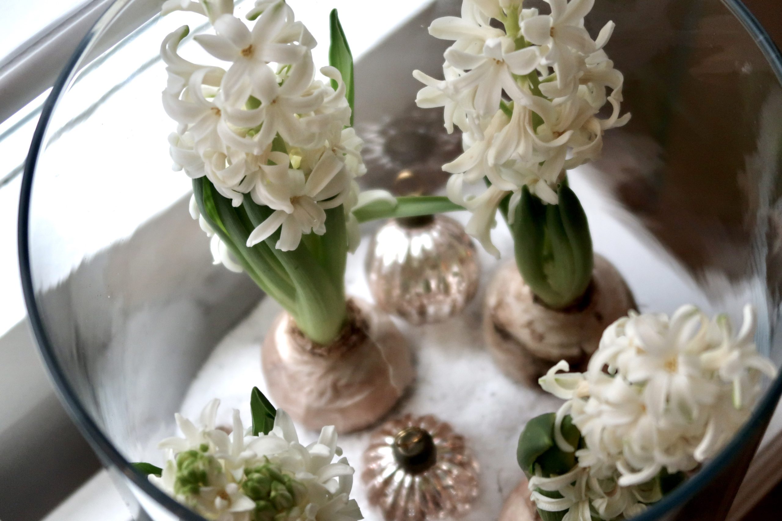 Har pysslat ihop lite härliga glascylindrar med hyacinter, vit sand och julkulor.