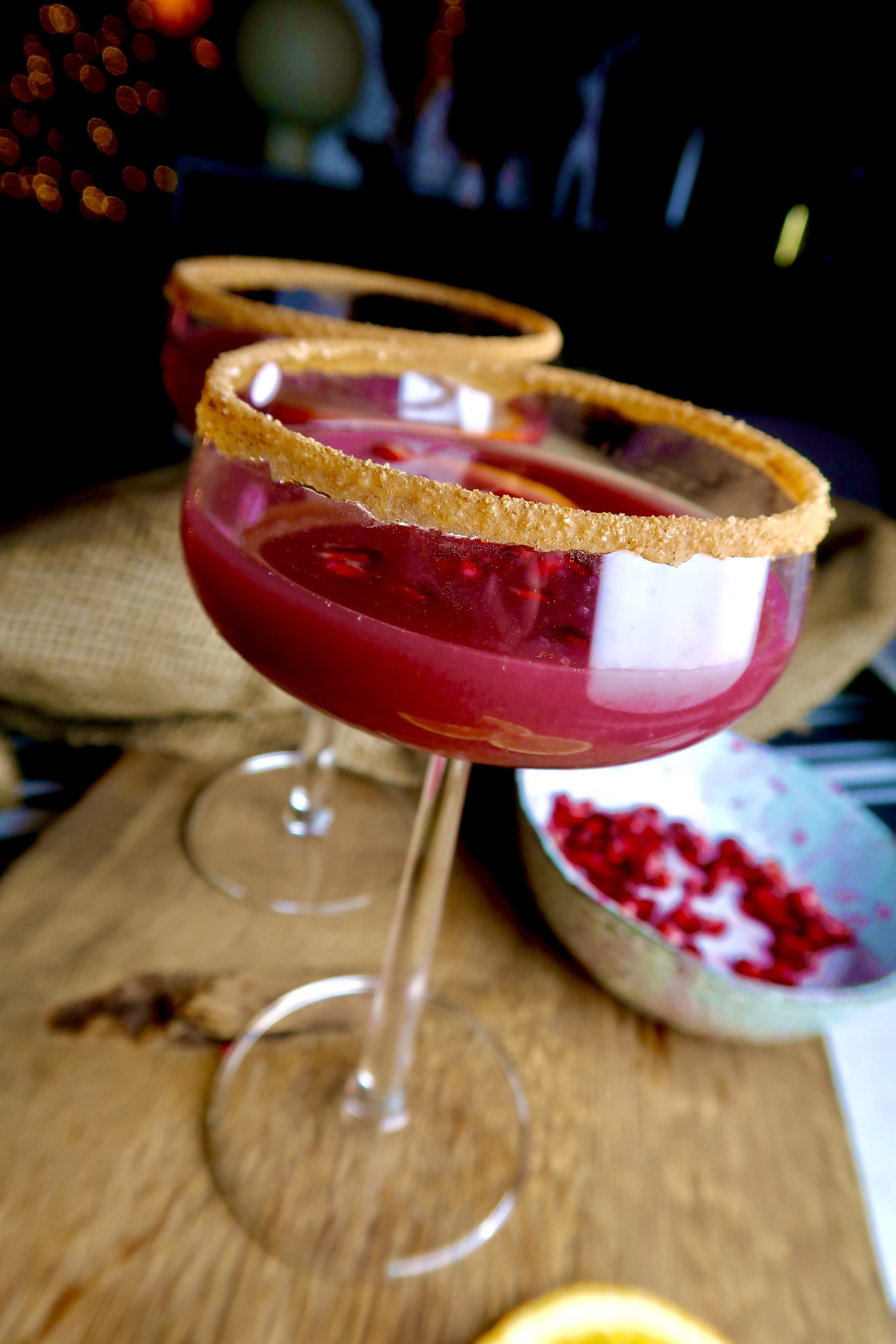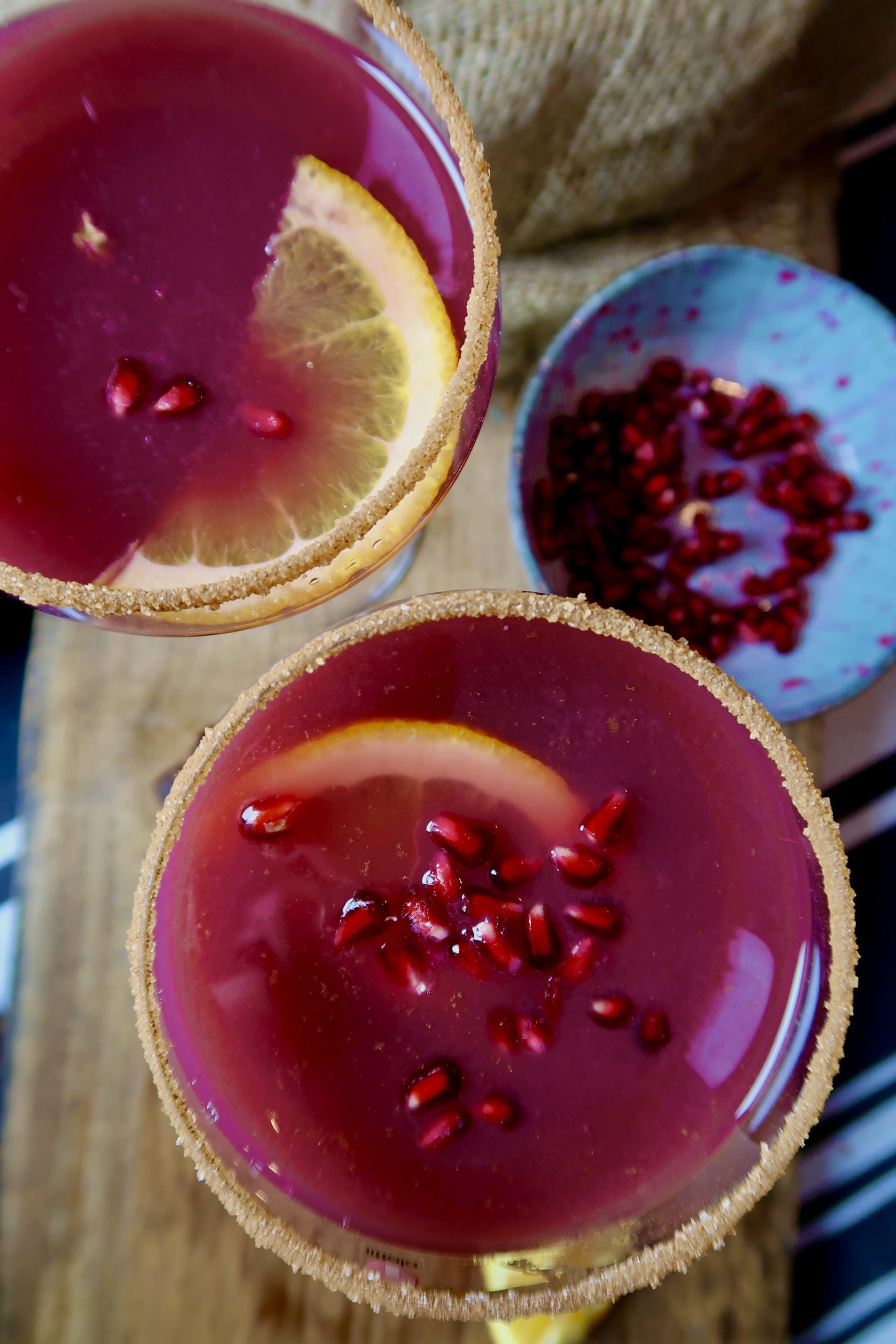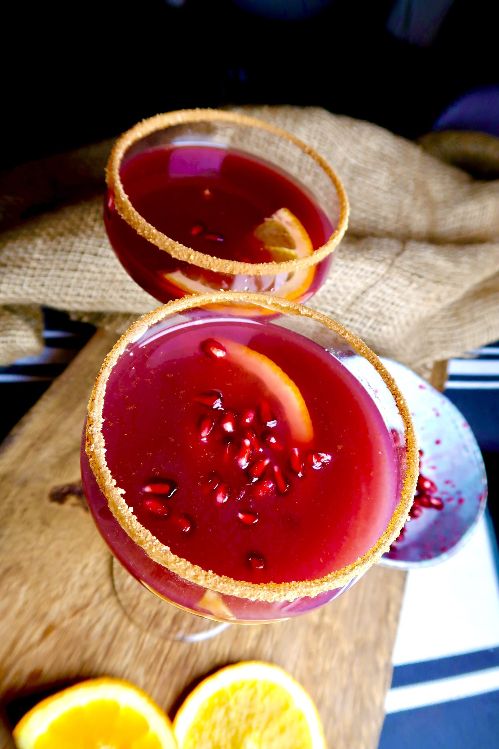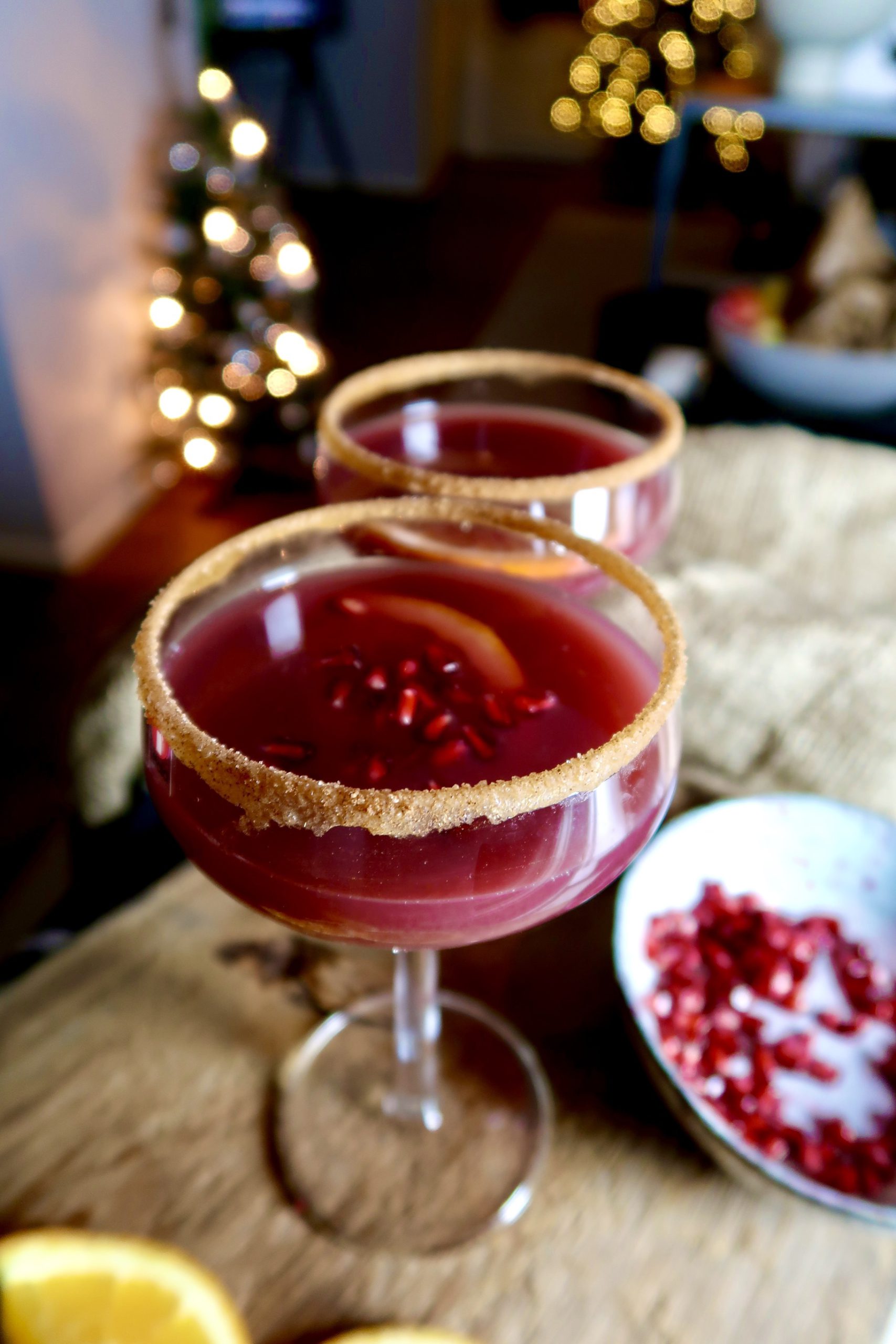 4) Häll i julsangrian i glasen och ha i apelsinskivor och granatäpple. Sååå mumsigt! Gör gärna om proceduren med lönnsirap och socker/kanel när du fyller på glasen.