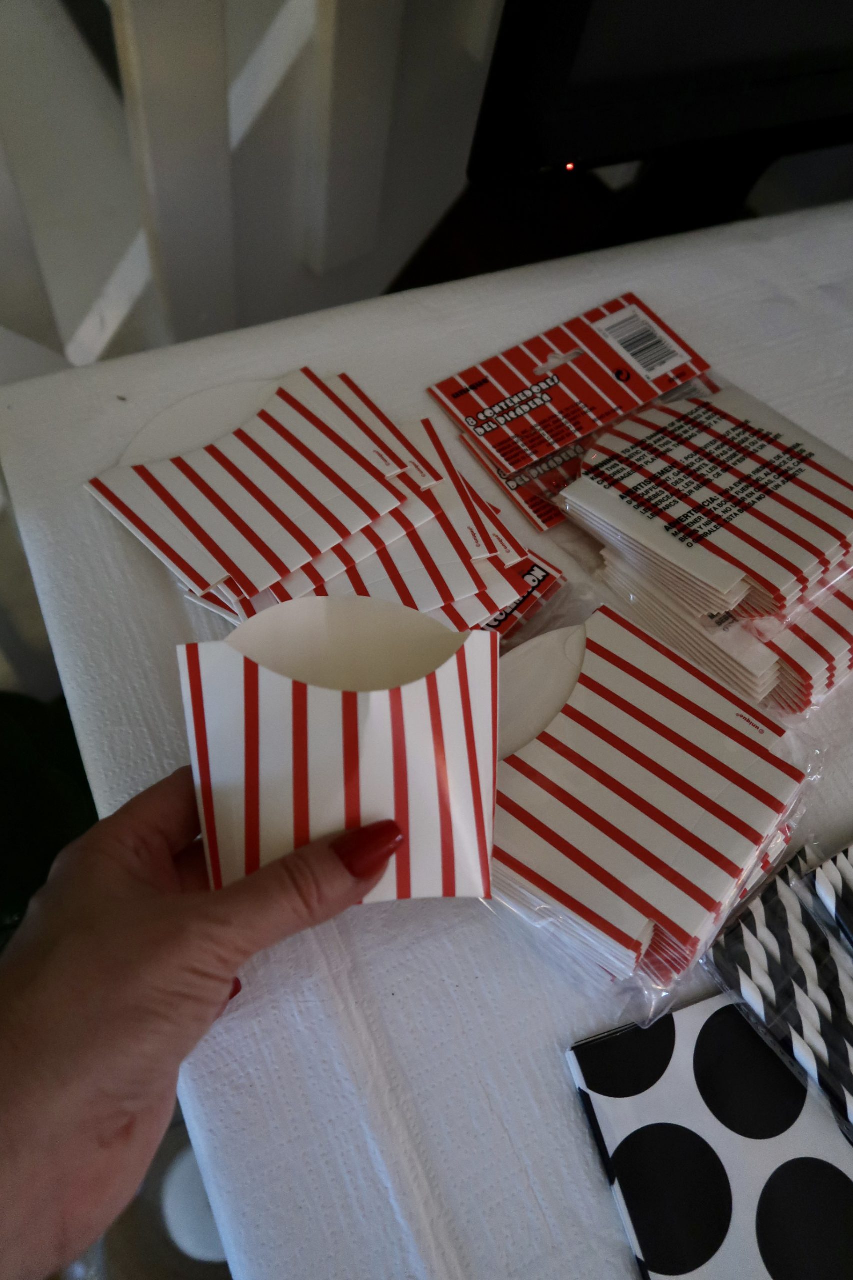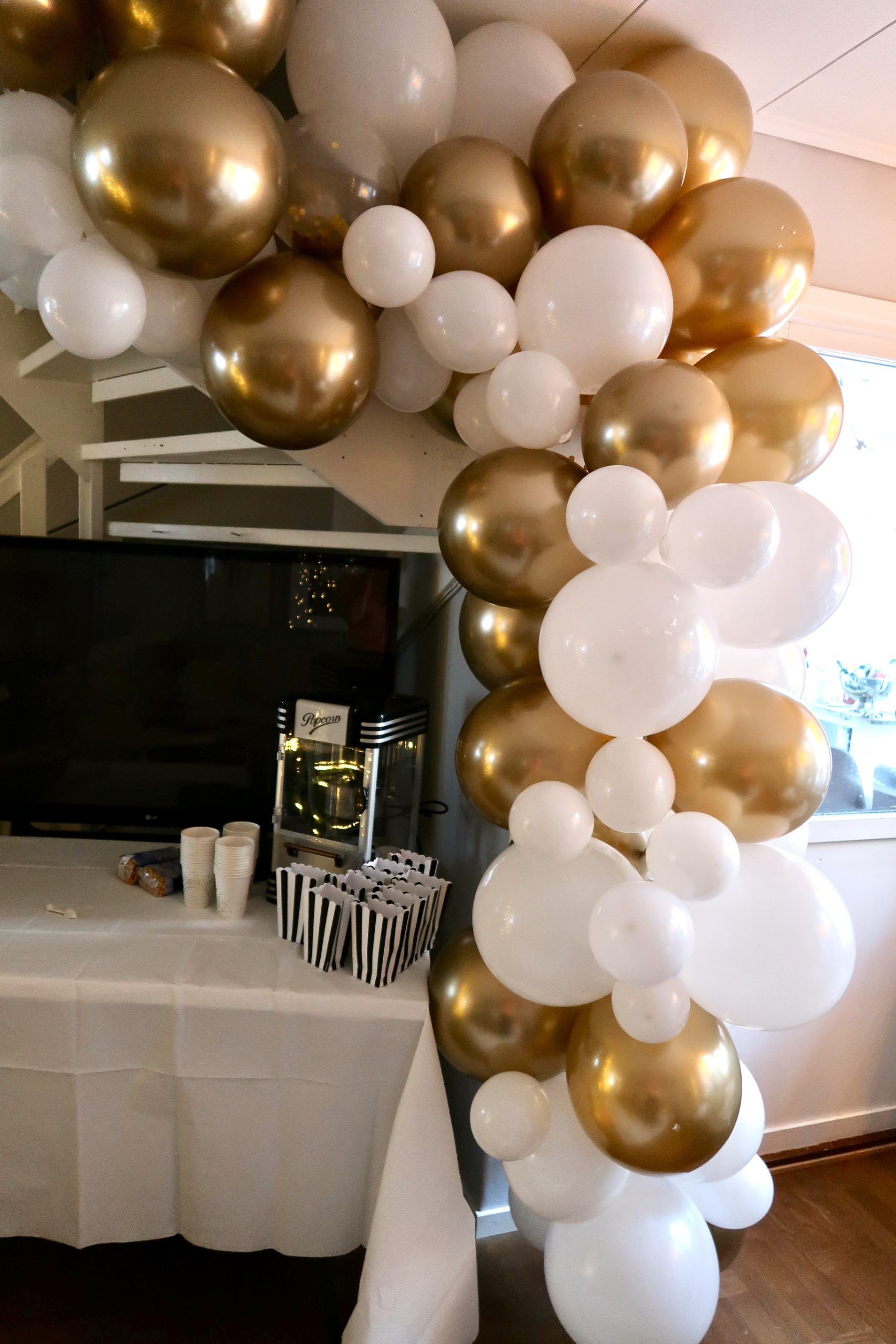 Som vi roddade för kalaset alltså. Det blev precis så som jag hade hoppats på. Här var förberedelserna igång för fullt. Köpt allt på Partykungen. Popcornbägare i olika sorter hittar du HÄR. Stripsbägare HÄR. Hamburgerboxar HÄR. Ballongbåge HÄR, finns sååååå många fina. Trodde dom skulle vara mycket dyrare, köper man en sån här klar är den ju svindyr. Men att köpa en sån här box, och såklart en ballongpump så hör du en själv. Tar lite tid men blev ju sååå bra!