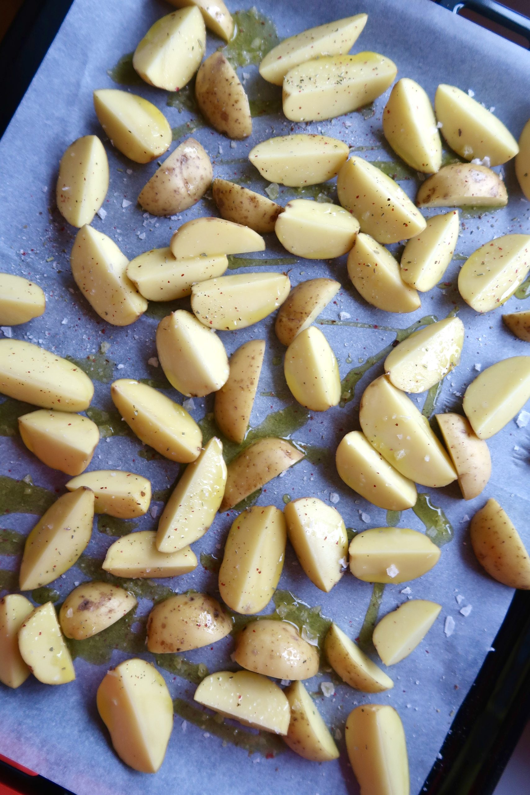 Jag köpte gourmetpotatis, den är bäst! Sedan är det bakplåtspapper, lite olja och flingsalt på som gäller. Rör om med fingrarna och skjuts in i ugnen.