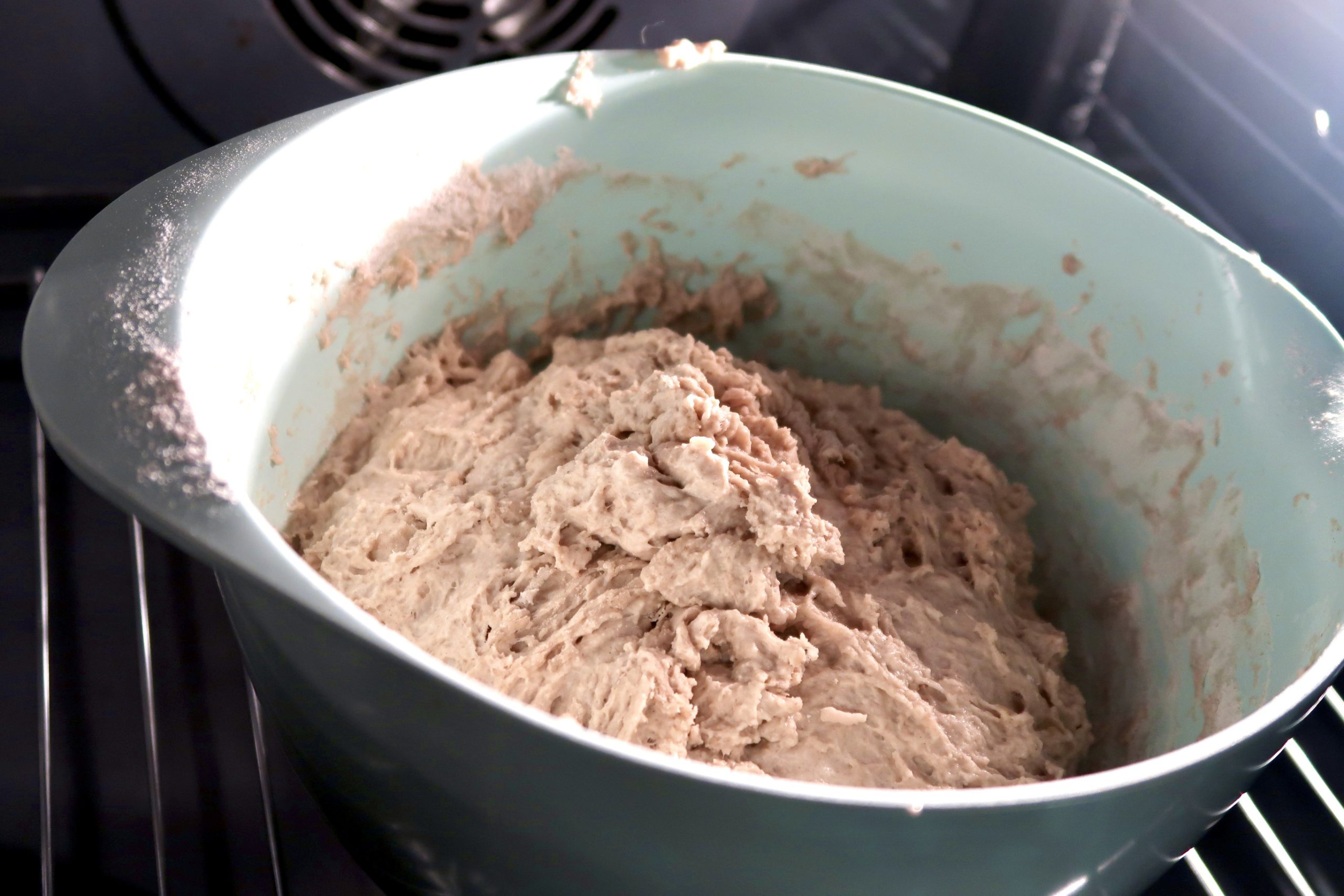 2) Låt jäsa i min ugn i 45 min 😛 eller i en bunke under bakduk i 1 1/2 timme.