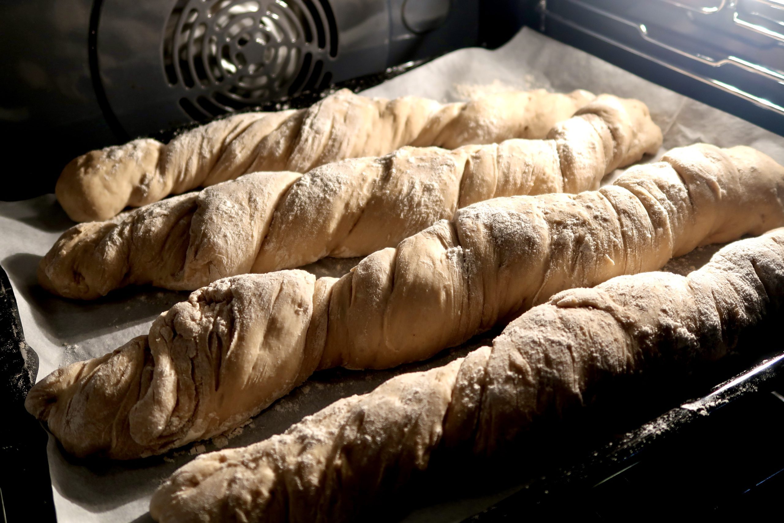 3) Ta upp degen på mjölat bord, men knåda den absolut inte. Rör den så lite som möjligt. Dela den i fyra delar. Forma till vridna baguetter och lägg dem på bakplåtsklädda plåtar. Pudra över lite mjöl och låt dem jäsa under duk cirka 30 minuter.