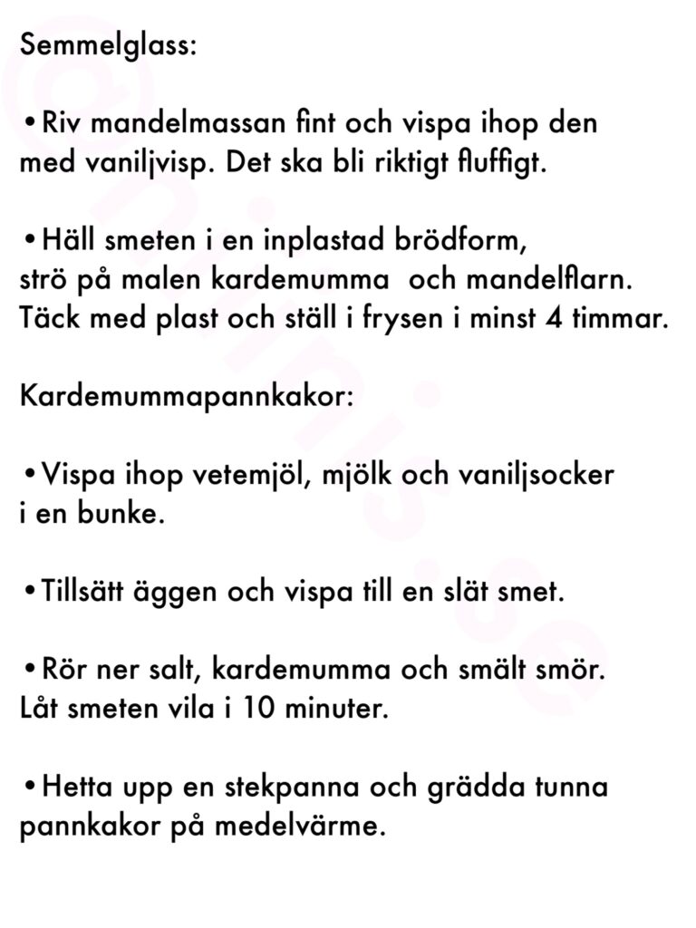 Letar du efter ett ljuvligt recept som kombinerar klassiska pannkakor med smaken av semla? Då måste du testa dessa kardemummapannkakor! De är luftiga, smakrika och har den perfekta balansen av kardemumma och sötma. Tillsammans med en krämig semmelglass, gjord på vaniljvisp och mandelmassa, blir detta en riktig smaksensation. Dessa kardemummapannkakor är enkla att göra och passar perfekt till frukost, brunch eller som en lyxig efterrätt. Läs vidare för att få det fullständiga receptet!