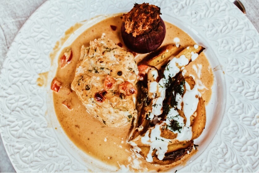 Kyckling med potatiskaka, godaste gräddsåsen och syltad lök