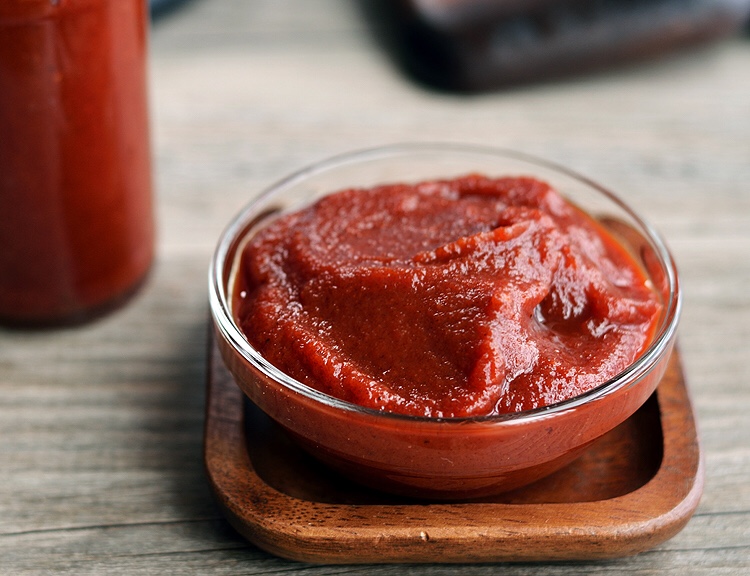 4) Häll tillbaka i blendern. Kör blendern tills den är smidig och len. Häll i varmt vatten vid behov tills du har en ketchupliknande konsistens.