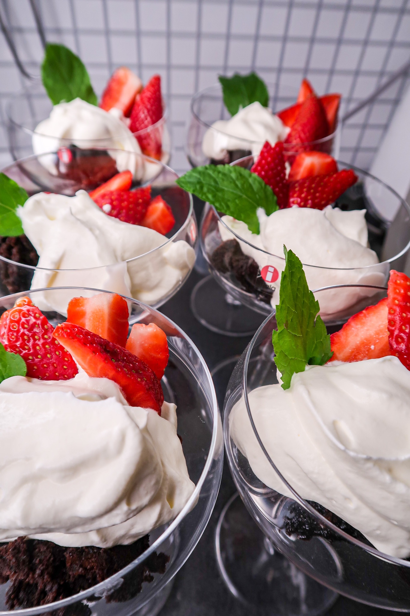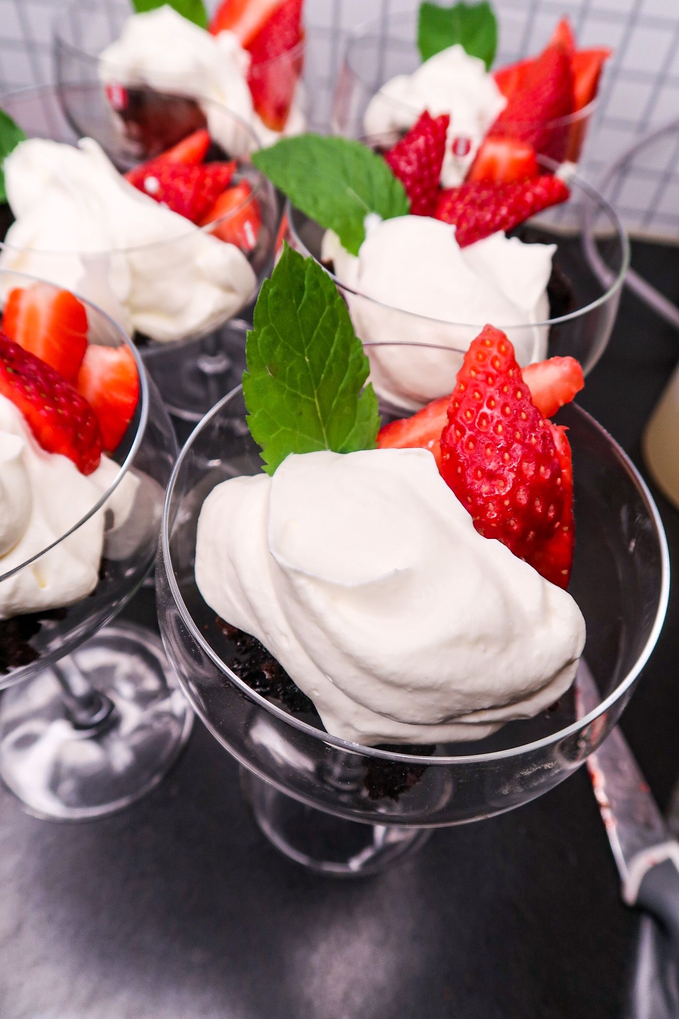 6) Låt kladdkakan gärna svalna helt. Ta sedan och skeda ur kakan och lägg i glasen. Toppa med vispad grädde, jordgubbar och myntablad.