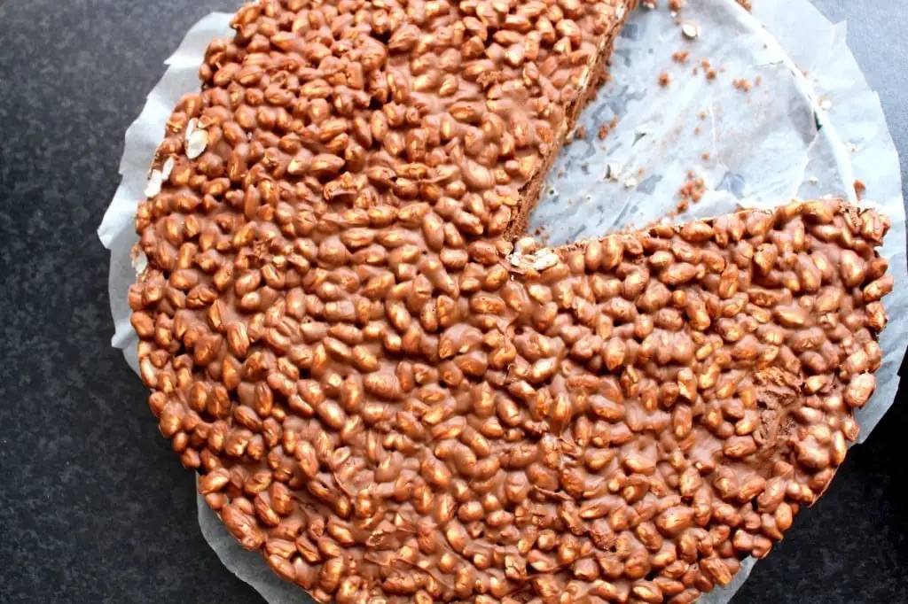 Smält chokladen över ett vattenbad. Häll i 3 dl rice krispies och blanda ordentligt. Fördela ut på den avsvalnade kakan. Låt sedan stå kallt tills allt satt sig. Innan servering så ställde jag den dock i mikron i ca 30 sekunder. MMMMMMMMums så gott det blev alltså! ♥