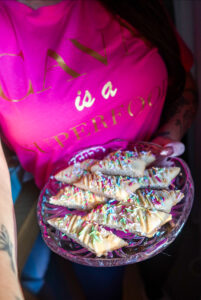 Se till att vara lite snabb med strösslet efter att du ringlat på glasyren, då fastnar strösslet på glasyren innan det torkar vilket gör att strösslet sitter mycket bättre.