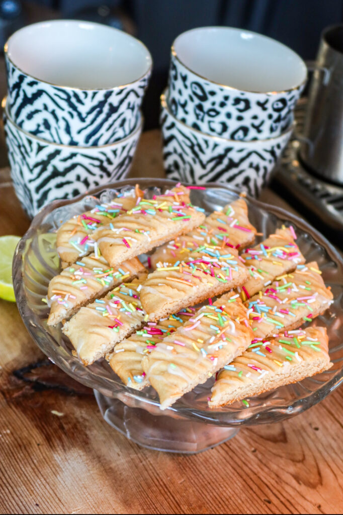 Det här lilla fatet som jag serverade till fikat, ja swish sa det så var allt slut. Dom blev så goda, älskar smaken med den söta kolasnittskakan och så den syrliga limeglasyren uppepå. Crunchet av strössel gjorde inte saken sämre heller!