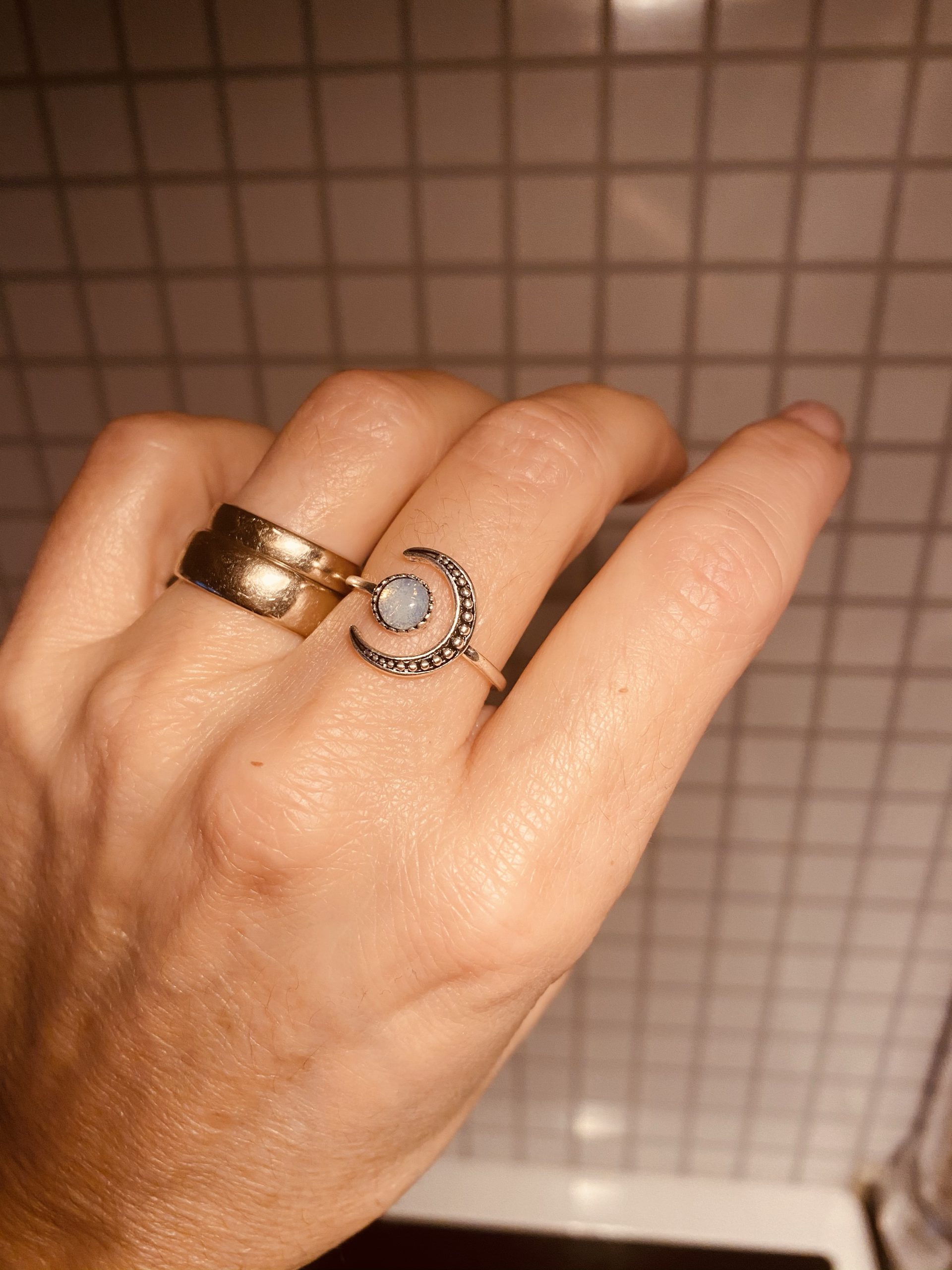 Kolla vad min barndomsvän var och lämnade här hos mig? En ring med en månsten på. Ja jag är ju så intresserad av kristallers kraft och har fått mycket hjälp av dem genom åren. Nu bär jag med mig en vacker månsten också. Blev så himla glad, hon är så fin min Satu. ❤️