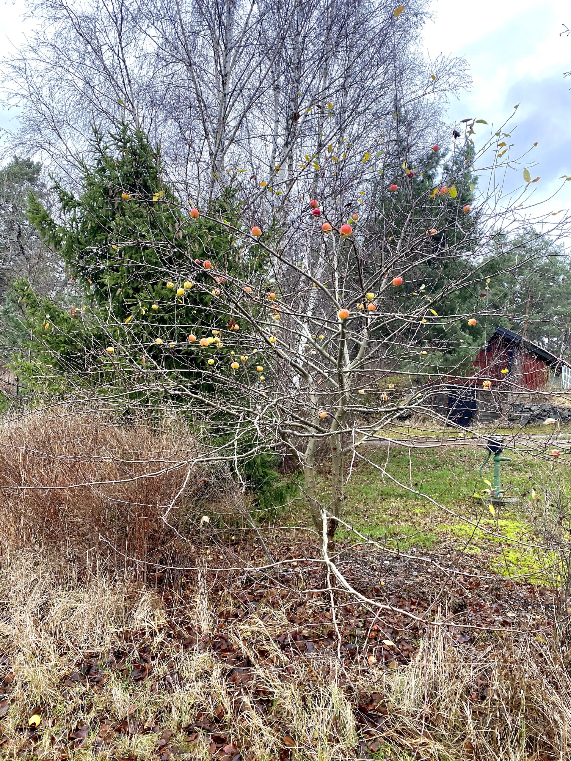 Hur häftigt träd med bara äpplena som är kvar på trädet? Såg så kul ut.