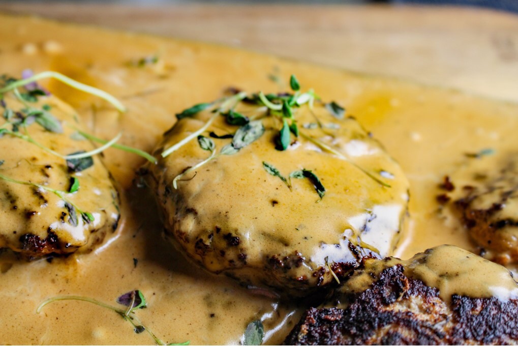 3) Gräddsås: Använd samma stekpanna som du använde till biffarna, plocka dock ur bitar om det finns efter färsen. Häll i grädden, kalvfond, soya och tomatpure. Koka upp. Låt sedan puttra i några minuter. Blanda majsredning och mjölk, häll i det i såsen och koka upp igen. Häll såsen över biffarna. Toppa med lite färsk timjan.