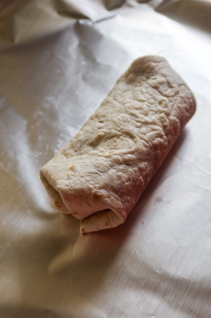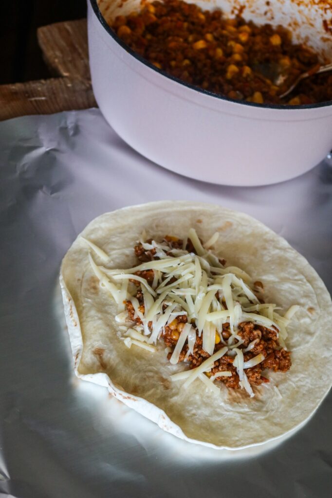 3. Fyll tortillabröden med köttfärsröran och toppa med riven ost, rulla ihop och rulla sedan in i folie.