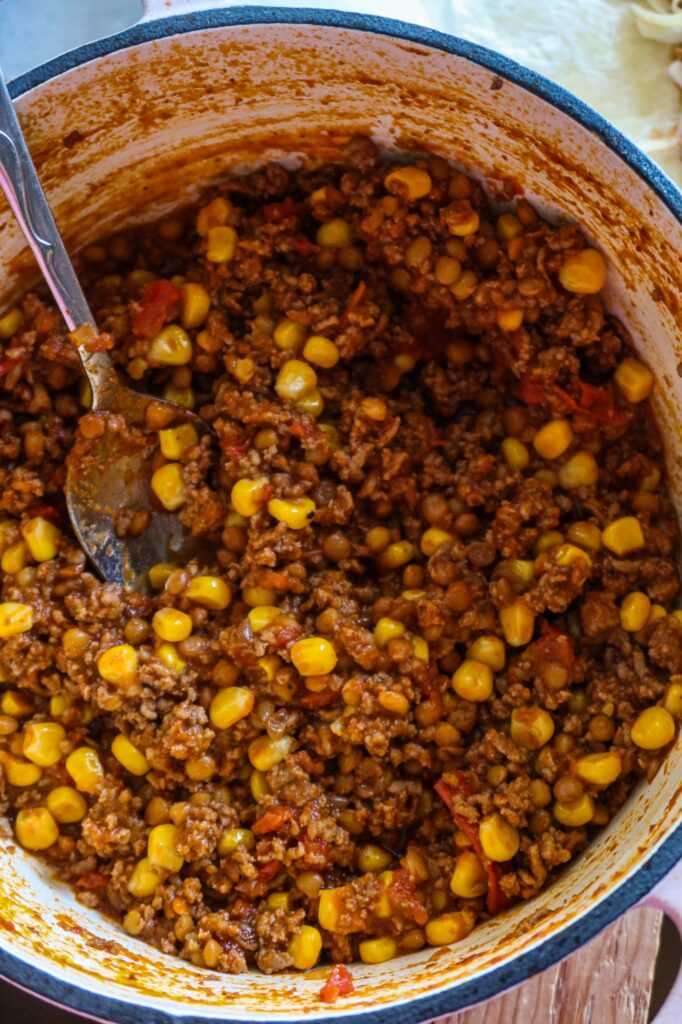 2. Häll i krossade tomater, linser, majs och vatten. Låt puttra tills att du fått en konsistens av tacofärs.