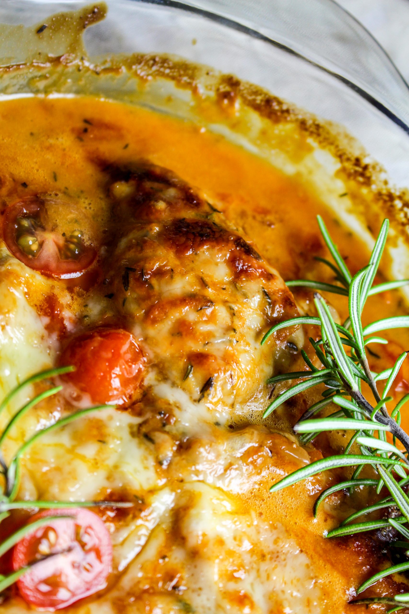 3) Häll gräddsåsen över kycklinglårfiléerna och toppa med osten. Ställ i ugnen på 225 grader i ca 20 min. Ta ut och dela resten av tomaterna och toppa med dem samt färsk rosmarin, funkar fint med basilika också.