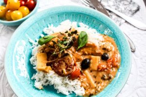 3) Skala och skär palsternackan i mindre bitar, ha i den. Ha också i soltorkade tomater, cocktailtomater och oliver. Sätt crockpoten på högsta värme och låt tillagas i 3 ttimmar. Gör du i gjutjärnsgryta så har du den med folie som lock i ugnen på 130 grader i ca 3 timmar. Efter ca halva tiden har du i timjan och basilika.