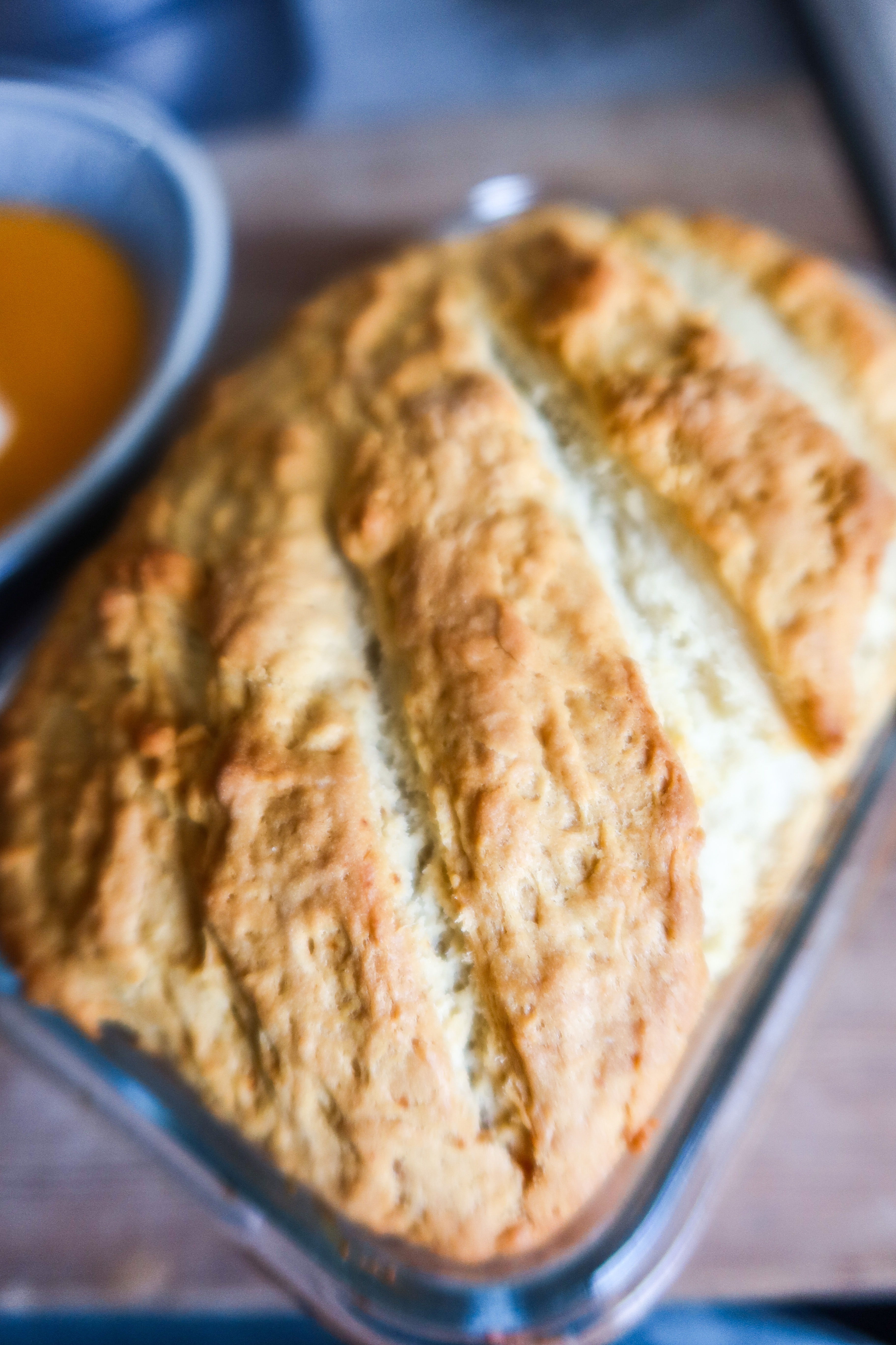 3) Sätt ugnen på 180 grader, blanda sedan alla ingredienser i en bunke. Tillsätt mjölk, sirap och smälta smöret och blanda ihop till en kladdig deg. Lägg degen i en limpform eller som jag gjorde, i en glasform. Klä den med bakplåtspapper först bara.