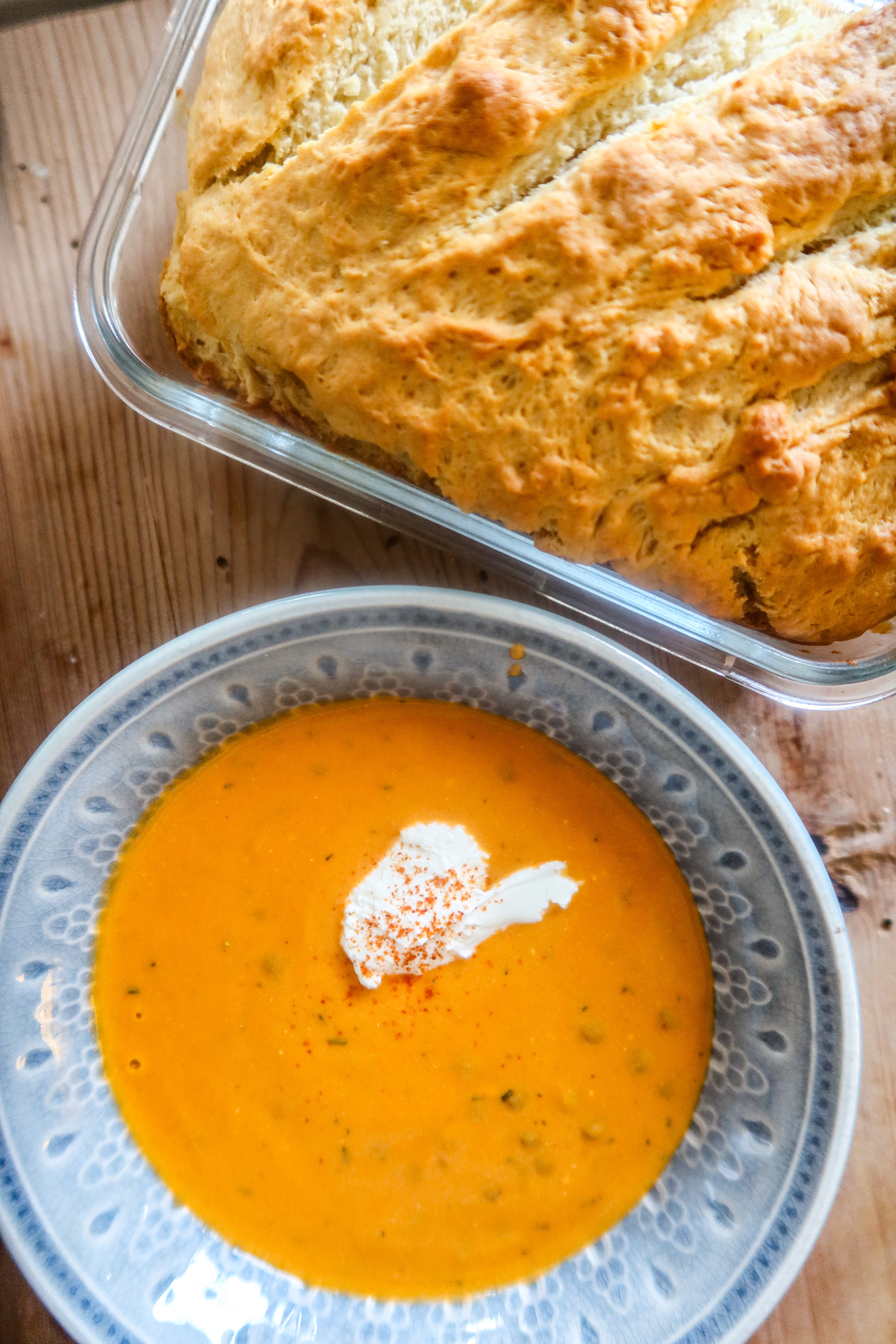 Tiden springer som vanligt och jag har fått de där första höstkänslorna, har dina infunnit sig än? För mig är hösten soppor, grytor och murriga hem med tända ljus. Så med det kom suget att börja testa lite nya soppor. Här gjorde jag riktigt enkelt för mig, men wow så himmelens gott detta blev. Du måste testa! Det blev en krämig linssoppa och ett snabbt bröd som jag bakade till. Brödet, åh det blev så gott. Har en lite sådär krispig yta och passade riktigt bra till den krämiga linssoppan. Tänk vad gott när man kan doppa brödet i soppan och surpla i sig. Den här soppan är löjligt enkel att svänga ihop, jag lovar dig! Och perfekt till hösten.