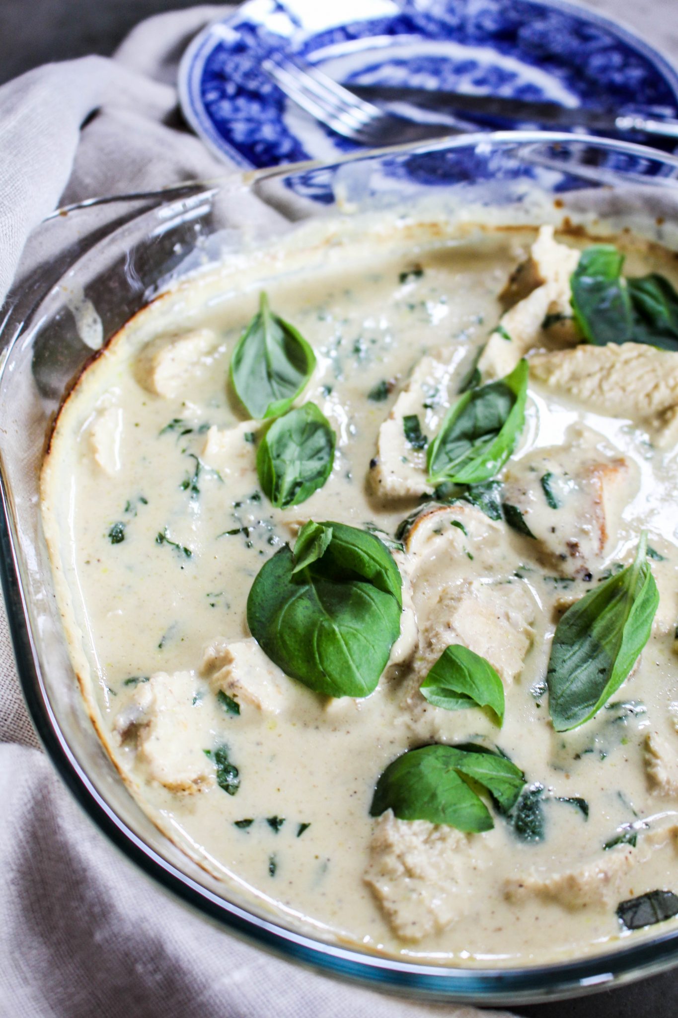 4) Ta ut kycklingen och häll på gräddblandingen, ställ i ugnen i ytterligare 15 minuter. Kolla så att kycklingen är helt genomstekt innan. Dela upp kycklingfileerna i skivor men låt dem ligga kvar i såsen. Servera med ris, potatis eller pasta.