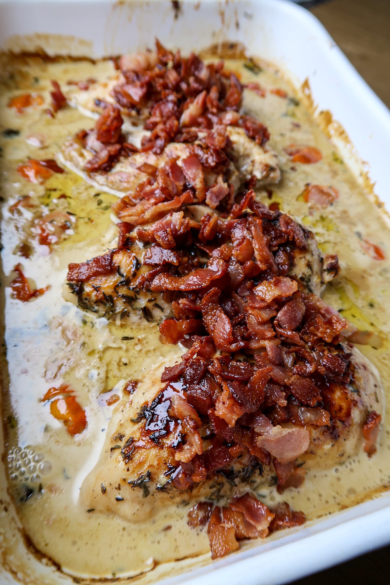 4. Klipp baconen smått och stek dem till de är lite knapriga. Häll av fettet. Ta ut kycklingen och strö över det knaperstekta baconen innan servering.