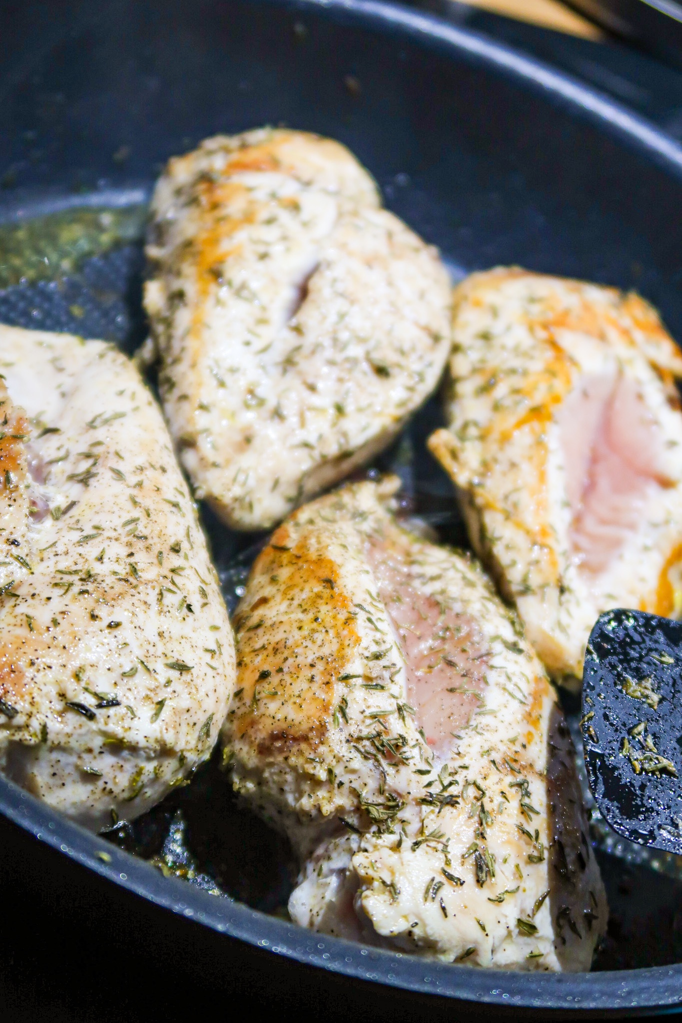 1. Sätt ugnen på 225 grader. Salta, peppra och krydda kycklingen med örterna. Stek kycklingen i smör så den tar färg. Ha gärna ganska så hög värme.
