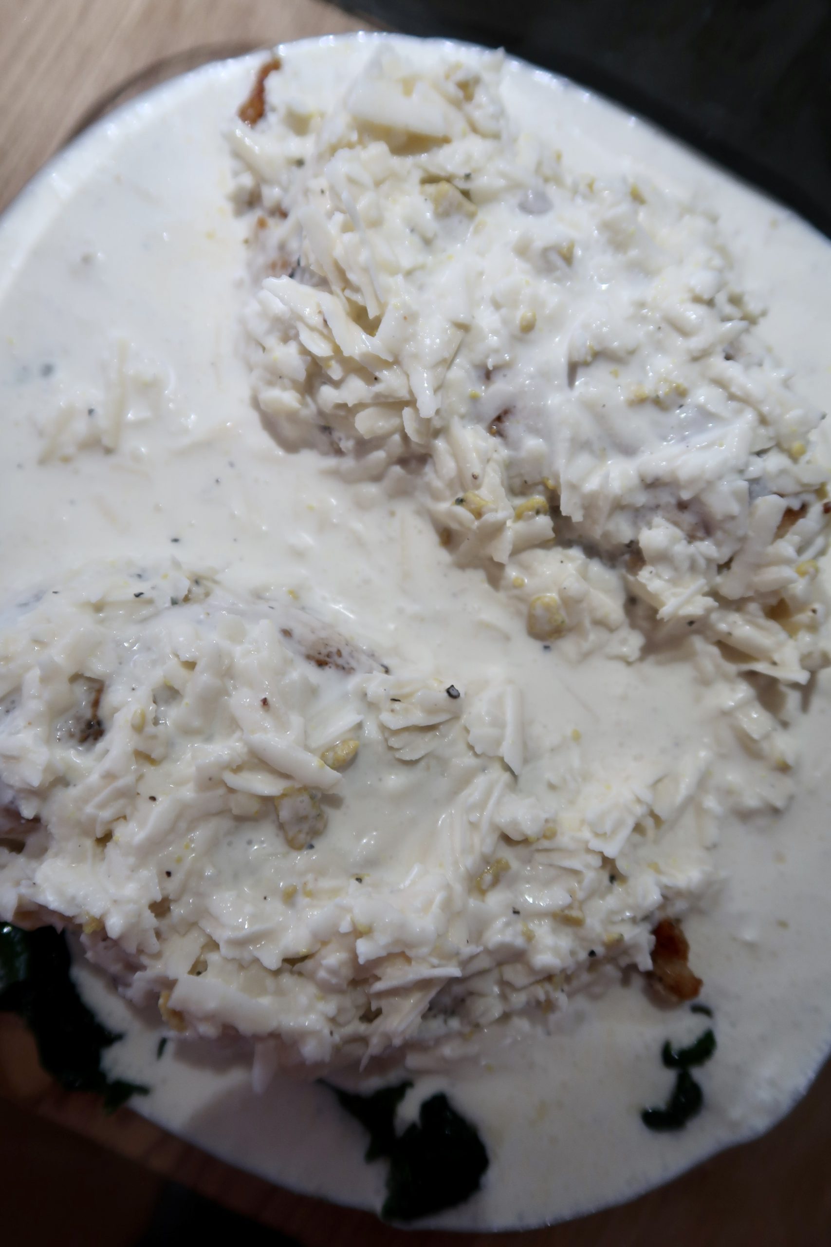 3) Såsen; Blanda alla ingredienser i en bunke. Häll allt över kycklingen och spenaten. Fördela ut parmesanen så den är över kycklingen också. Skjuts in i mitten av ugnen på 200 varmluft, har du inte varmluft kör du vanlig ugn på 225 grader i ca 15 min. Osten ska börja få färg. Servera med t ex pressad potatis eller ris.