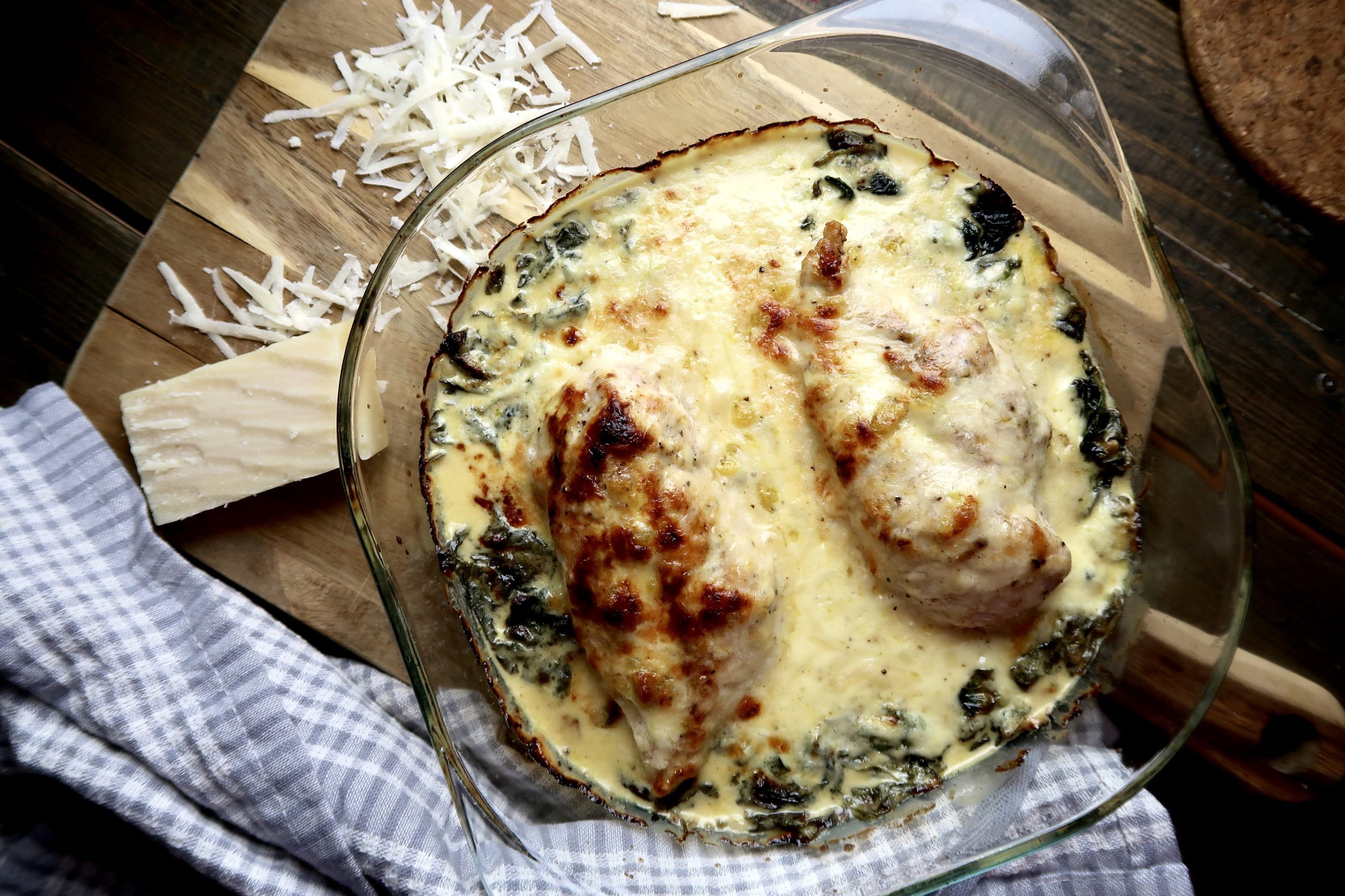 KYCKLING I UGN PÅ SPENATBÄDD MED PARMESAN & VITVINSSÅS, 3-4 portioner