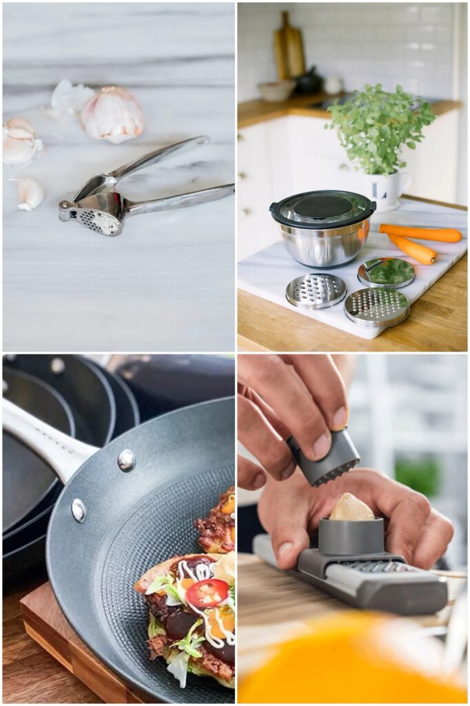Superbra vitlökspress // Perfekt bunke med lock (super att skaka gurksallad i – den har jag) // Min favoritstekpanna (lättviktsgjutjärn bästa jag haft) // Fint rivjärn (perfekt när du river t ex vitlök & ingefära så du inte skadar fingrar)