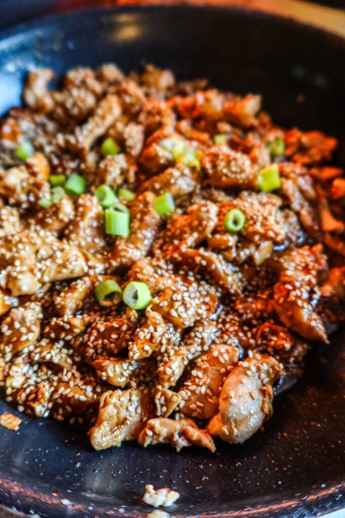 2) Stek strimlad kycklingfile i lite olivolja. Salta & peppra. Häll i teriyakisåsen och sjud runt i ca 1 minut. Strö över sesamfrön.