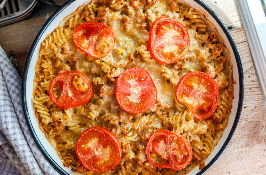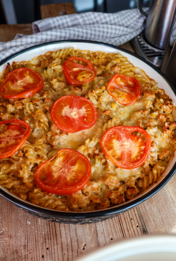 4. Häll kycklingfärssås över pastan, blanda ihop. Toppa med riven västerbottenost och några tomatskivor. In i ugnen på 225 grader tills osten börjar få fin färg.