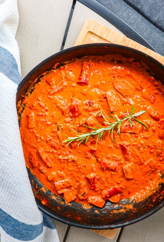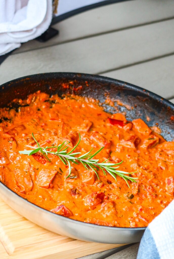 En god favorit här hemma är kycklingkorvstroganoff. Många kanske glömmer bort att korv ju finns som kycklingkorv, och att den smakar väldigt mycket som vanlig korv. I vår familj äter vi nästan bara kycklingkorv, igår köpte jag kycklingchorizo och kycklinggrillkorv. Detta blev en snabb lördagslunch för ett tag sen, och jisses så gott det blev med kycklingstroganoff. Som sagt, detta har blivit en familjefavorit. Du kan ju byta ut korven i denna kycklingstroganoff till vanlig eller varför inte vego korv. Det gör du som du vill.