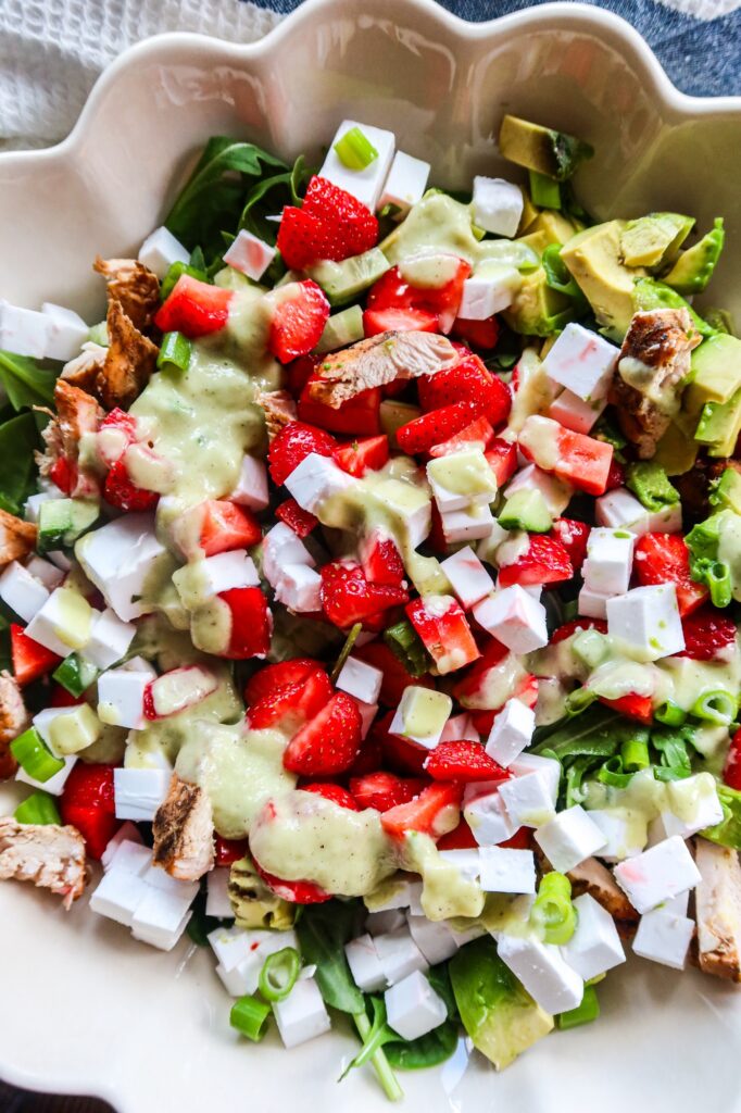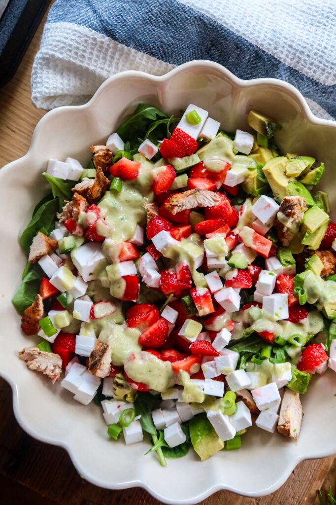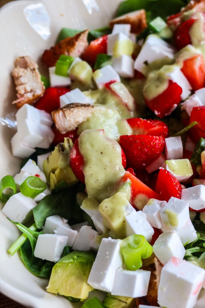 1. Lägg bladspenat och ruccola i botten på ett stort fat. Skär kycklingfile i mindre bitar, skär också feta i mindre bitar. Hacka salladslök och jordgubbar. Jag delade dem i 4.