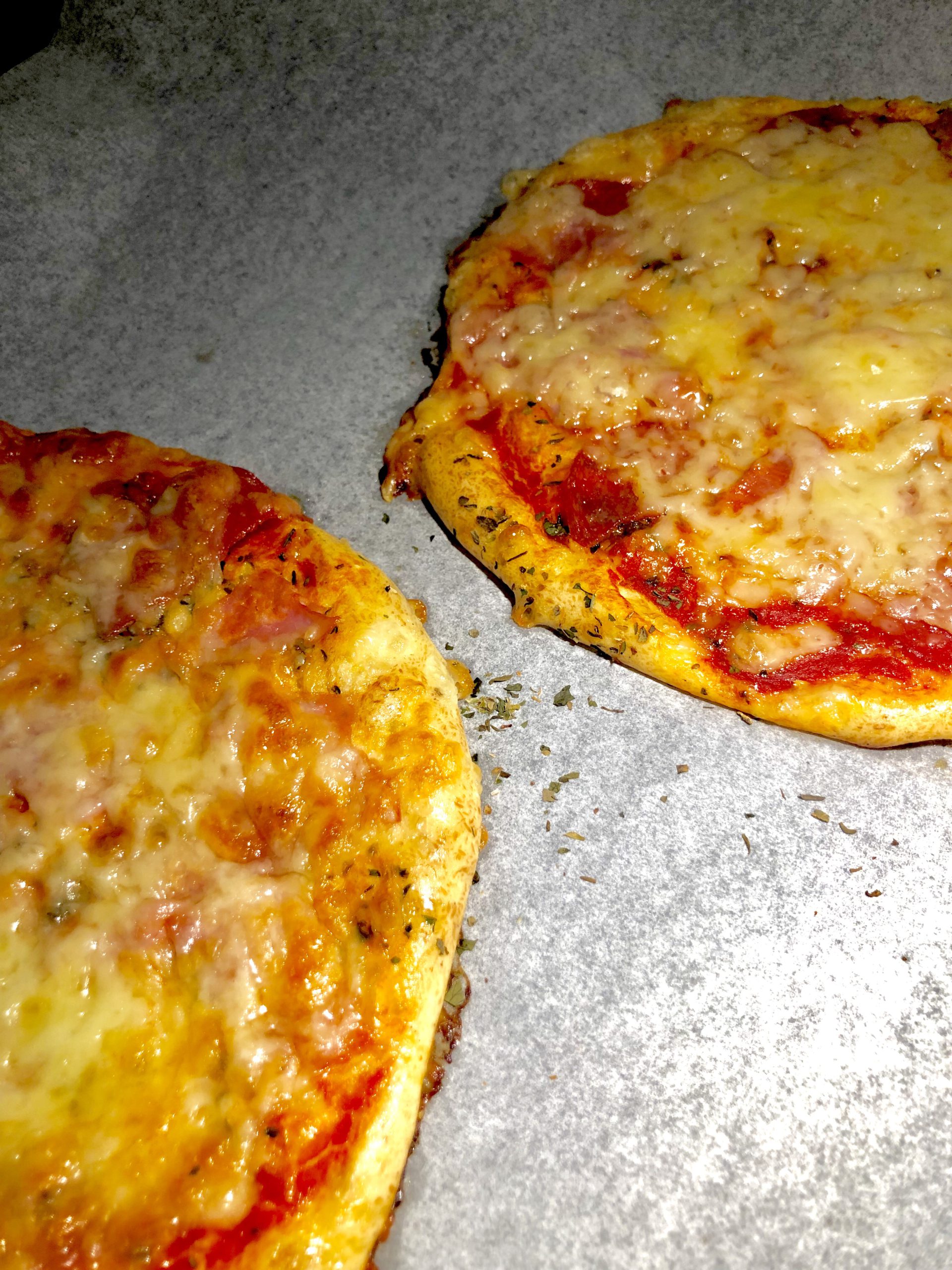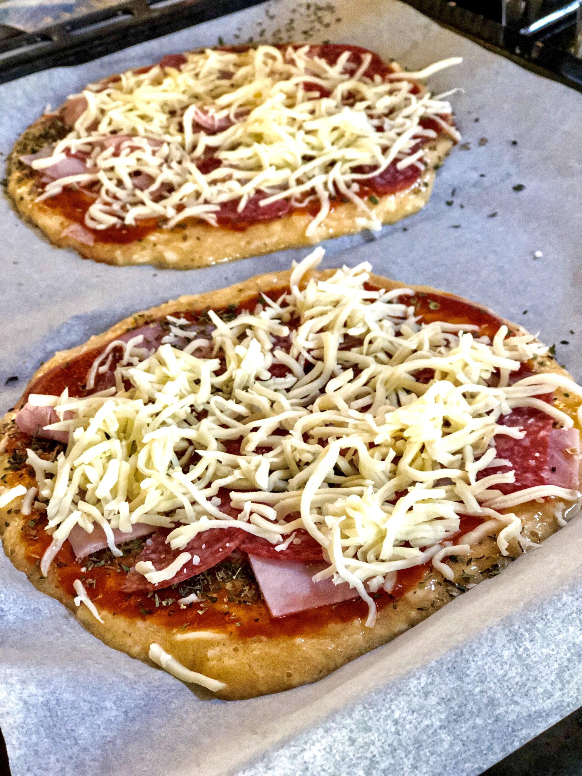 3) Gör 2 pizzabottnar på bakplåtpappersklädd plåt, jag använde en stor sked då degen är nästintill rinnig.