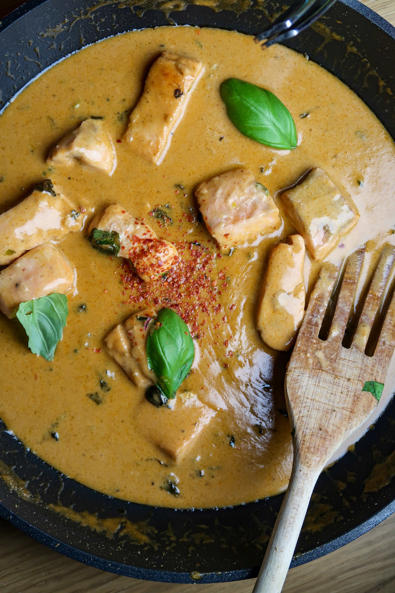 3) Häll på kokosgrädden. Rör ihop ordentligt och låt koka upp. Ha i sweet chilisås och japansk soja. Strimla den färska basilikan och ha i den och rör om. Lägg sedan i laxkuberna och låt sjuda med ca 6-7 minuter.