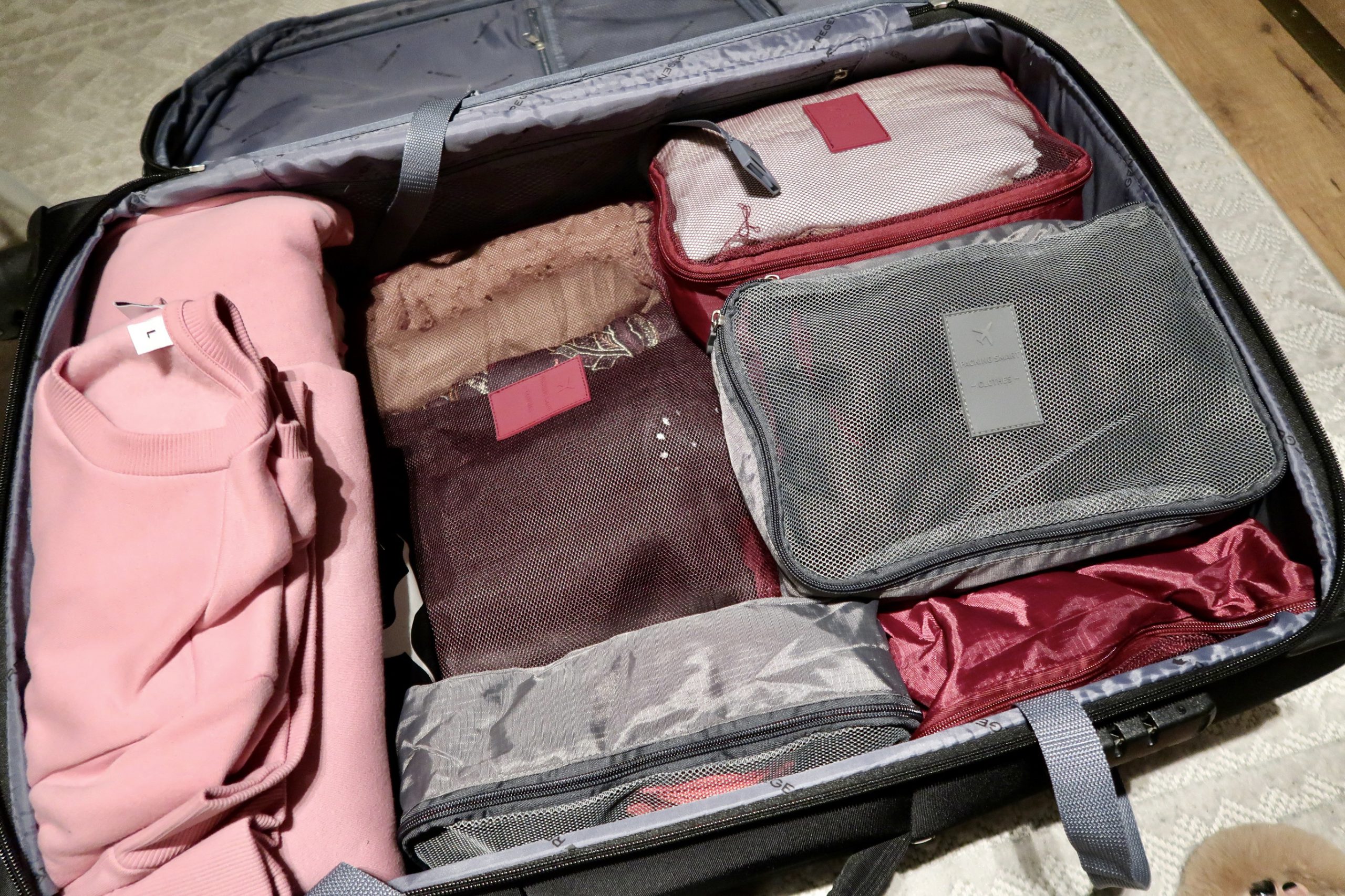 Nej men hörni! Det blev ju liksom hur bra som helst. Jag köpte två såna här set. Sen packade jag linnen och t-shirts i en. Tröjor i en. Bh:ar och trosor i en. Byxor i en…. Ja men ni fattar. Det enda som inte fick plats var myskläderna, dom rullade jag ihop i botten på resväskan.