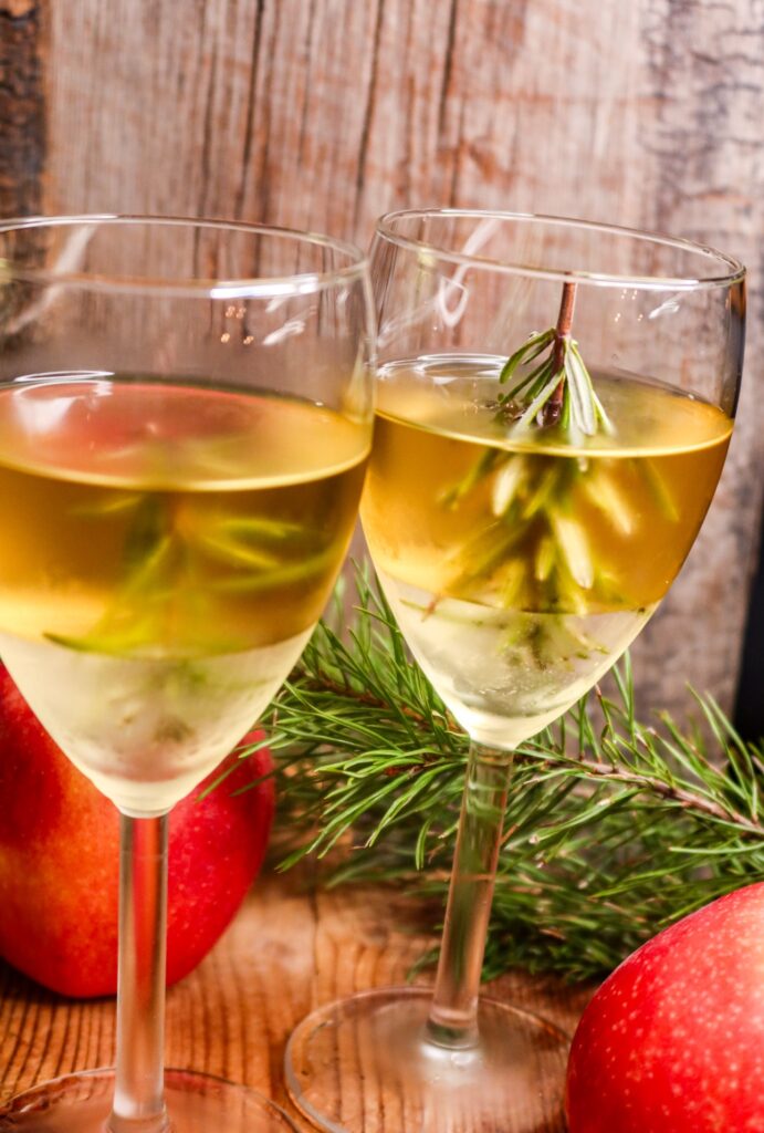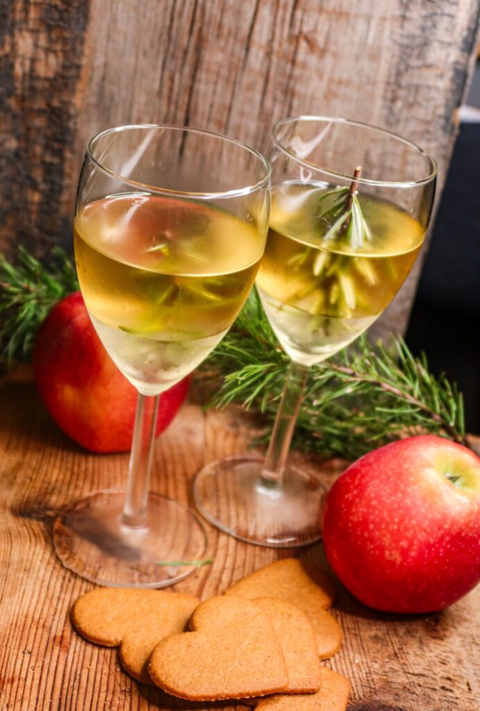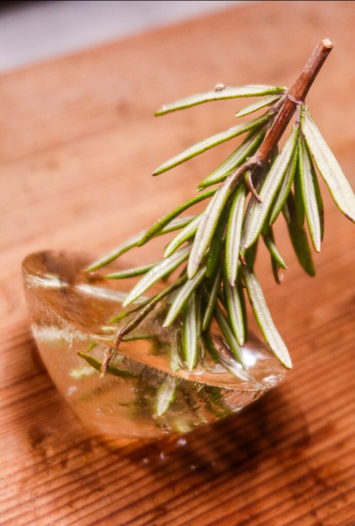 Ett litet tips till glaset såhär i juletider. Lite vatten i botten på ett vinglas eller ett typ whiskyglas. Tror att ”granen” håller bättre styrsel i ett whiskyglas. Klipp sedan av en kvist rosmarin och sätt i vattnet, upp och ned så det ser ut som en gran. Frys dem. Sedan är det bara att hälla i något gott. Här var det kall äppelglögg i glasen.
