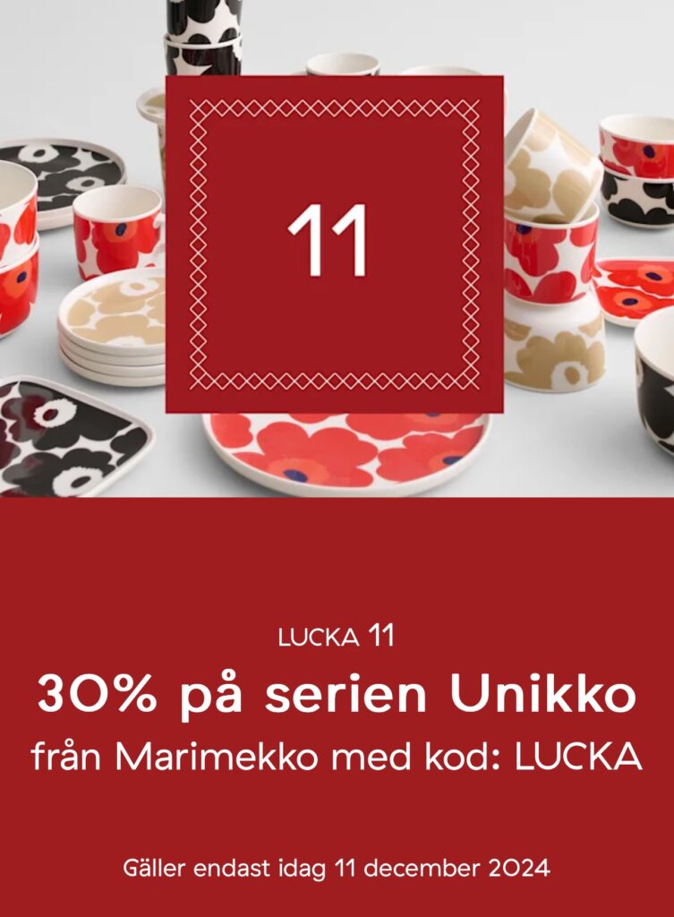 30% rabatt på Marimekkos serie Uunikko, ange rabattkod LUCKA. Finns om du klickar HÄR.