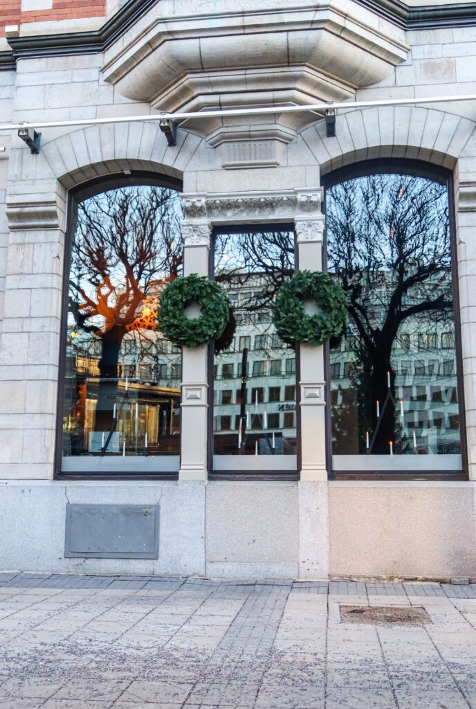 Kan man få nog av kransar såhär års! Idag ska jag köpa en krans, sen ska jag göra en också. Dessa fina såg jag förra året på Hotell Nobis fasad. Så vackert sätt att julpynta en fasad på!