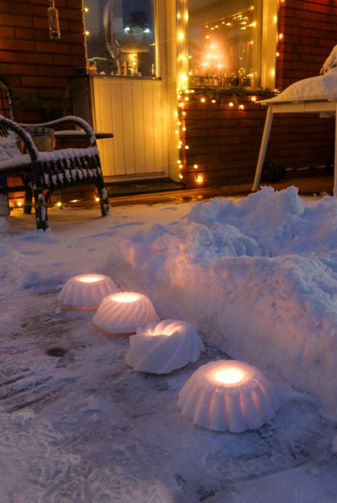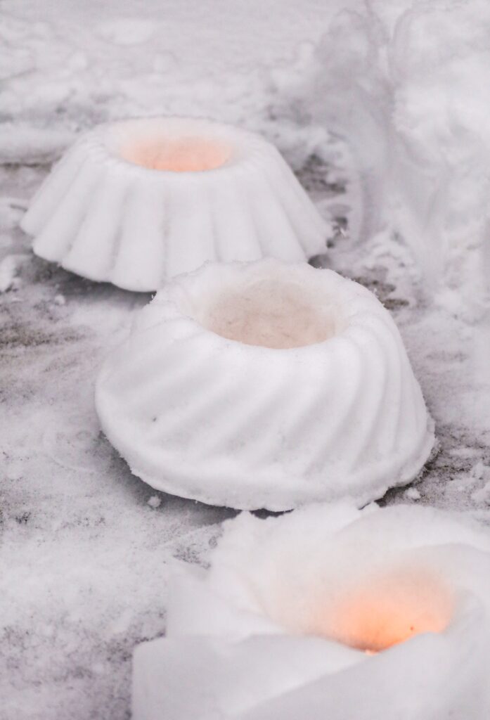 Gör snölyktor. Har du snö där du bor kanske du kan göra dessa enkla snölyktor som verkligen förhöjer myset ute i trädgården.
