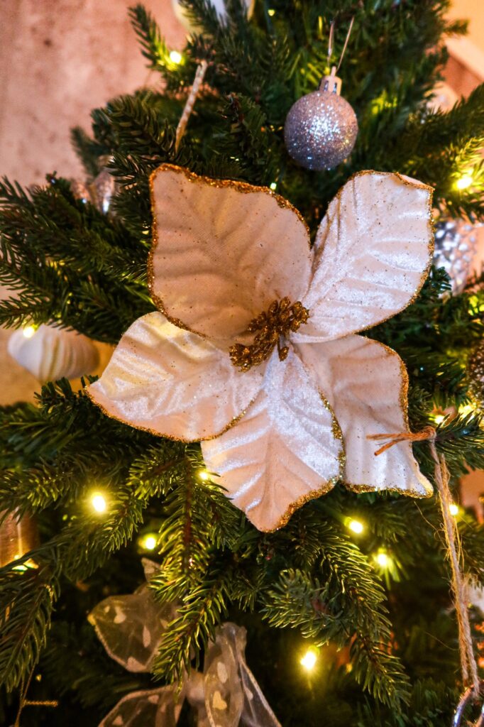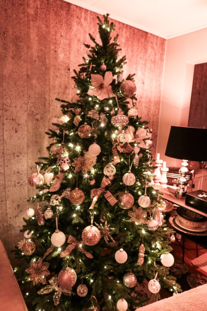 Vår julgran! Vet ni hur mycket jag älskar den. Nej men varje dag står jag och beundrar den. Den är precis så som jag vill ha den nu. Vi har plastgran men en sån som påminner mycket om en äkta. Det är bara längst in som den har de där lite plastiga fladdriga sakerna till granbarr, annars så ser den helt äkta ut. Vi har haft den i flera år, en sån med belysning som följer med, vårt nästa köp tror jag. Granen tror jag vi köpte på Rusta, det mesta förutom lite rosetter, en och annan kula och Uggla (fått av en av barnen) så är julpyntet från den härifrån (<klicka).