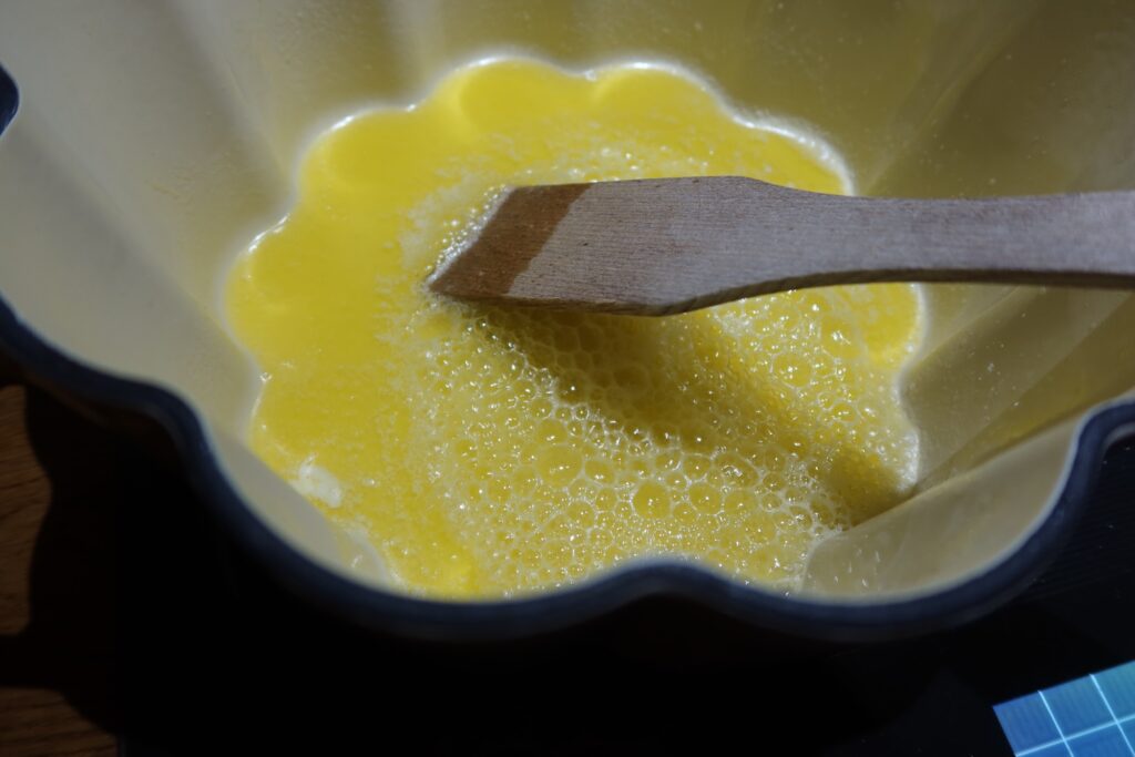 - Sätt ugnen på 225 grader vanlig värme. Bryn smöret i grytan, jag sätter på plattan på medelvärme och låter den gå länge. Först smälter den, sen börjar den få lite färg, här rör jag om ganska så mycket, när det börjar dofta nötigt så är den klar.