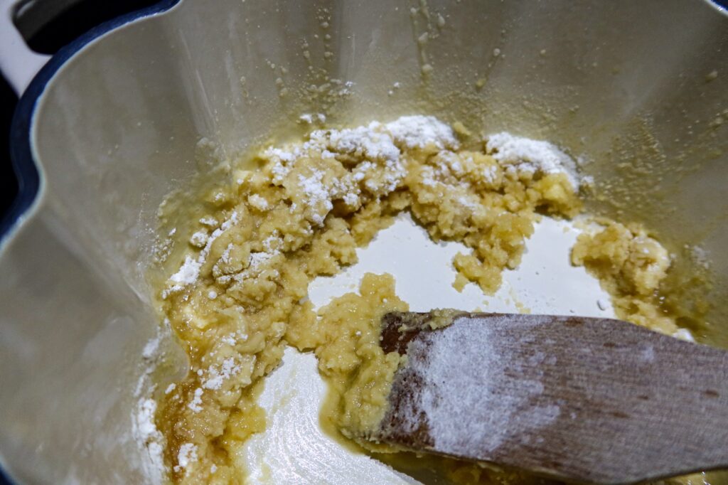 - Ha i strösocker, mjöl, bakpulver, vaniljsocker och pepparkakskrydda. Rör runt till en riktigt seg smet.