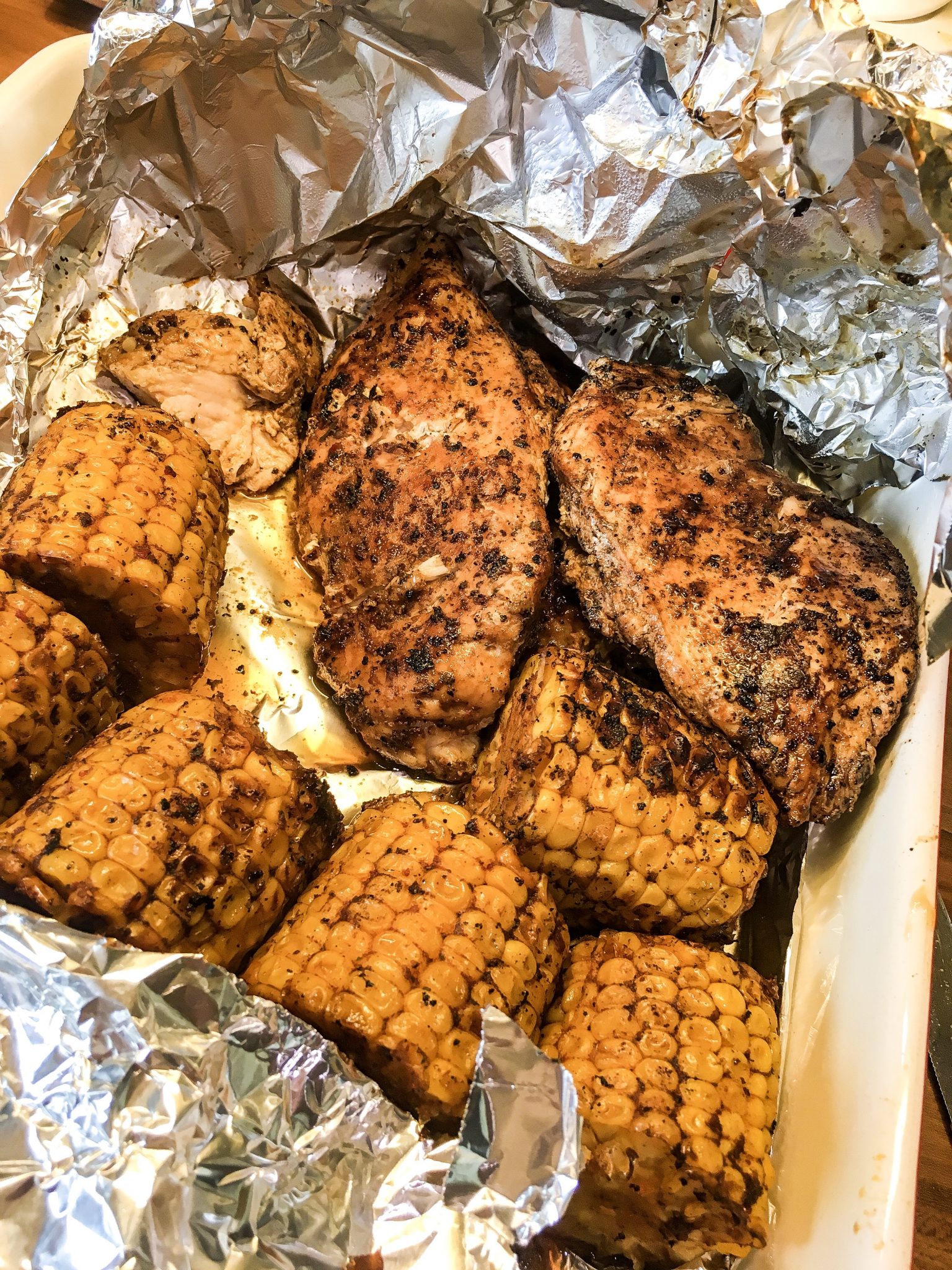 Det var entrecote och kyckling med grillade majskolvar som bjöds. Så gott!