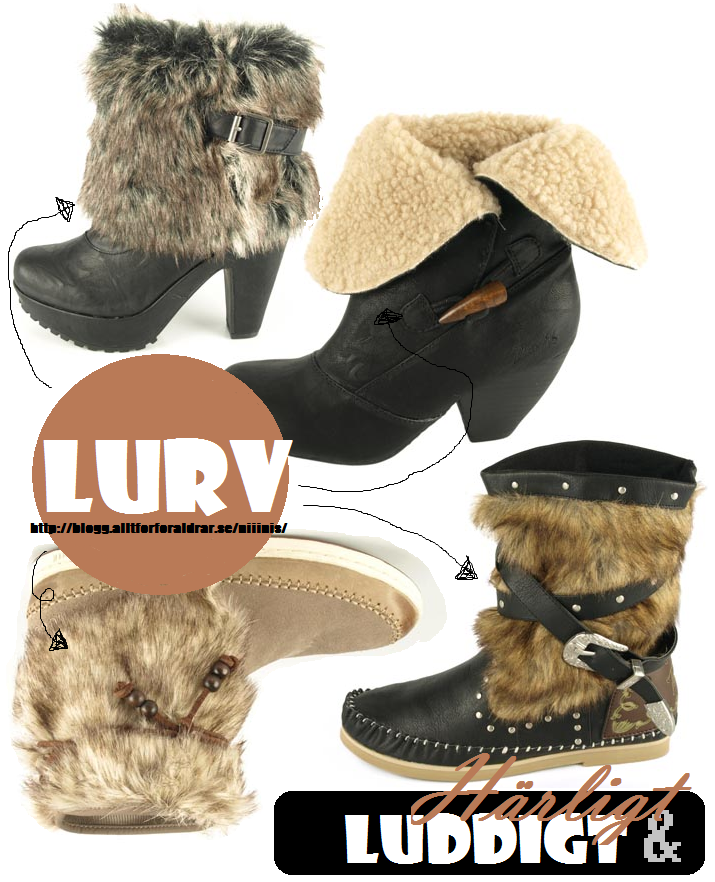 Har ni snappat upp den nya trenden? Luddigt runt stövelskaftet? Dessa stövletter är alla från Brandos. Där finns det en hel radda av lurvskor att införskaffa. Jag kan tycka att dom högst upp ser rätt fräna ut. Det är rätt festligt detta med dessa trender. Hur många gånger har man inte stått där med gapande mun och undrat vafasen dom nu hittat på? Det där skulle jag ALDRIG ta på mig. Sen går man där efter någon månad med exakt den prylen på sig. Man liksom vänjer sig vid tanken och säkerligen är det så att man ser produkten mer och mer och tillslut så fattar man ett tycke. Konstigt det där tycker jag! 😉