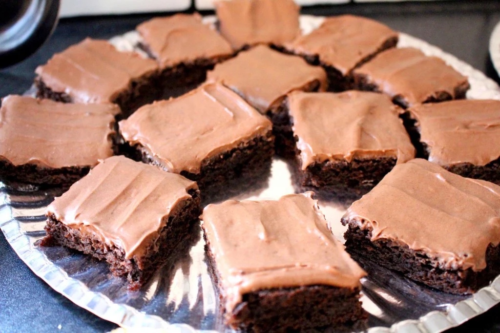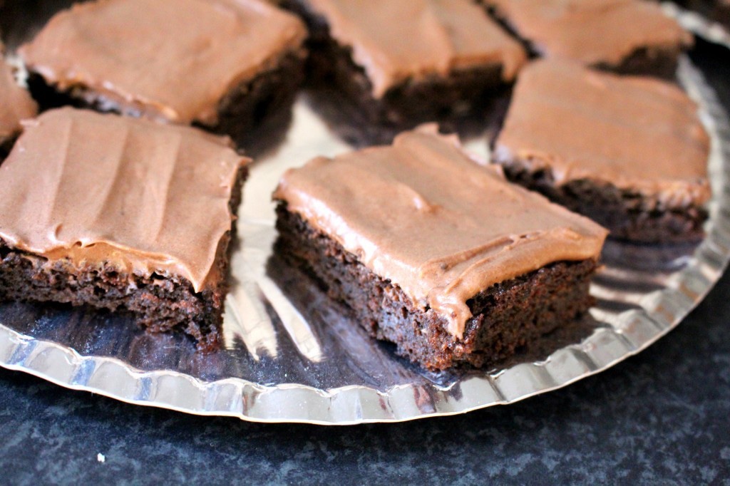 4) Klä en långpanna med bakplåtspapper. Häll smeten i pannan och grädda i ca 25 minuter. Gräddningstiden kan variera mellan olika ugnar, men börja kolla den efter ca 20 minuter. Känn med sticka, kakan ska vara kladdig och lite mjuk i mitten. Vi vill ju behålla det lite kladdiga.