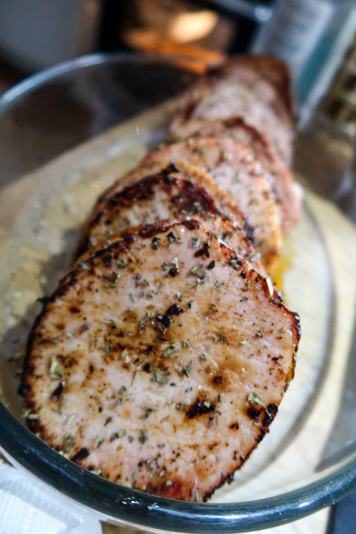 Då försteker du fläskfilén i skivor först (ca 2,5 cm tjocka), samma temperatur och samma tid i ugnen.