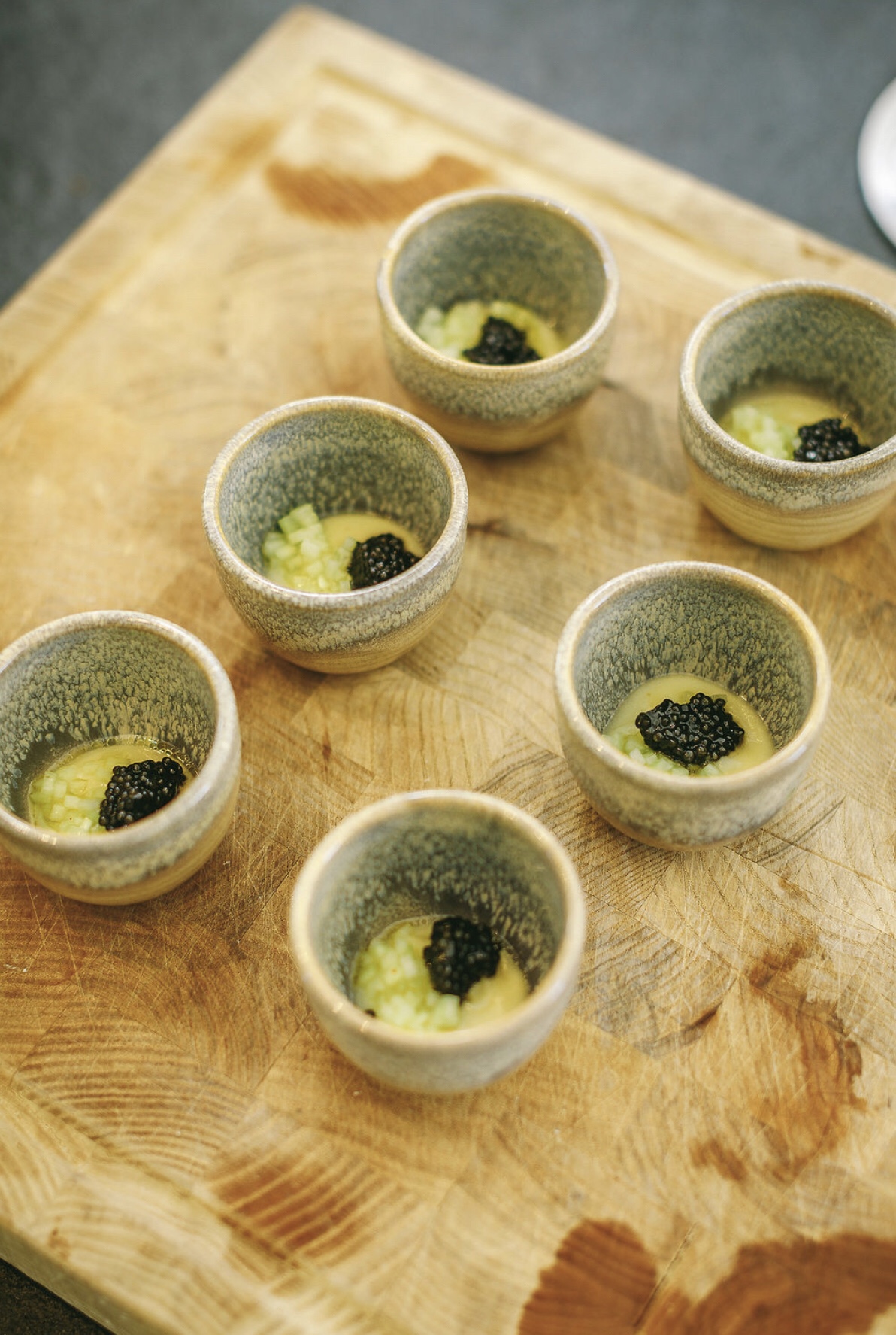 Sista snackset vi åt var jordärtskockspure med störkaviar och marinerad gurka. Såååå gott, Tony älskar jordärtskockspure så han var lyrisk.