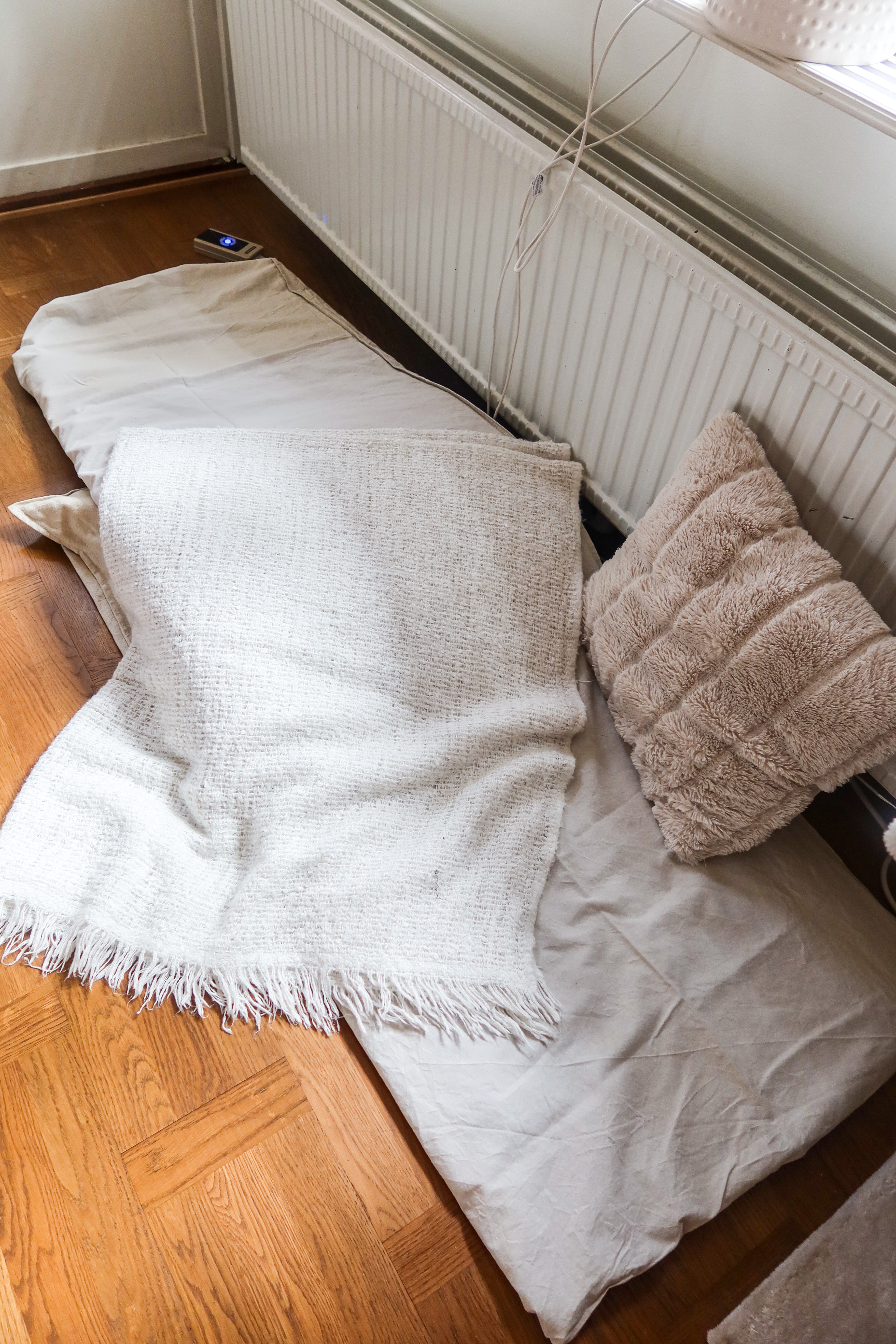 Jag har gjort i ordning ett hörn åt mig i vardagsrummet med ett påslakan på den, en kudde och filt. Detta är min lilla ”spa avdelning” som jag kallar den. 😌 Dessvärre är det fler k familjen som upptäckt det härliga med den här madrassen så jag får inte ha min ”spa-avdelning” för mig själv längre. Mer om det längre ned.
